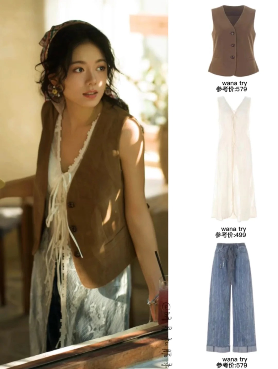 绑带连衣裙叠穿马甲+阔腿牛仔裤