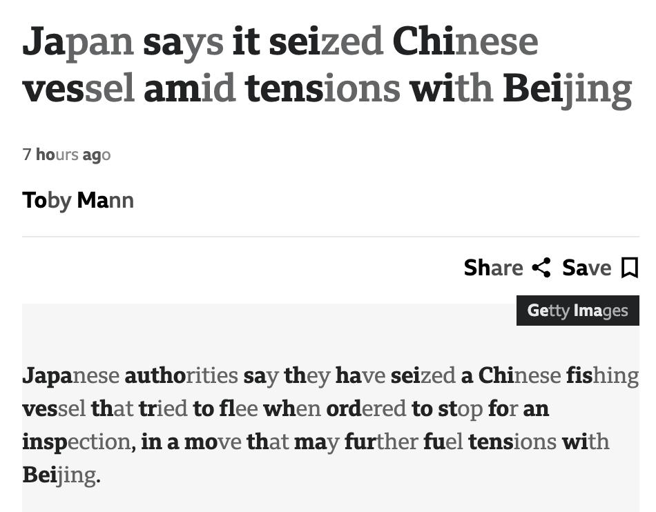 英媒:日本近日扣押了一艘中国渔船。据日本渔业机构称,这艘船在长崎县西南的日本专属经济区内被拦截,船长拒绝接受检查并试图离开,最终被扣押,船长被捕。 船上共有11人,包括47岁的中国籍船长。这是自2022年以来日本首次扣押中国渔船。此次事件可能进一步加剧两国紧张关系。 目前中国赴日游客减少,相关日本旅游和零售股票下跌,日本在华艺术演出被取消,甚至日本最后两只大熊猫也被送回中国。