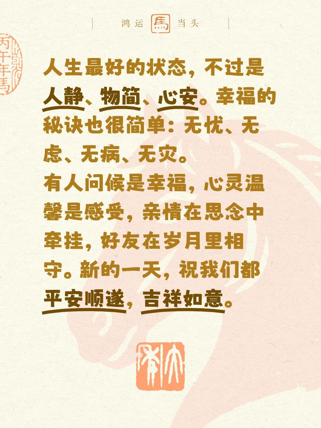 人生最好的状态,不过是人静、物简、心安。幸福的秘诀也很简单:无忧、无虑、无病、无灾。 有人问候是幸福,心灵温馨是感受,亲情在思念中牵挂,好友在岁月里相守。新的一天,祝我们都平安顺遂,吉祥如意。