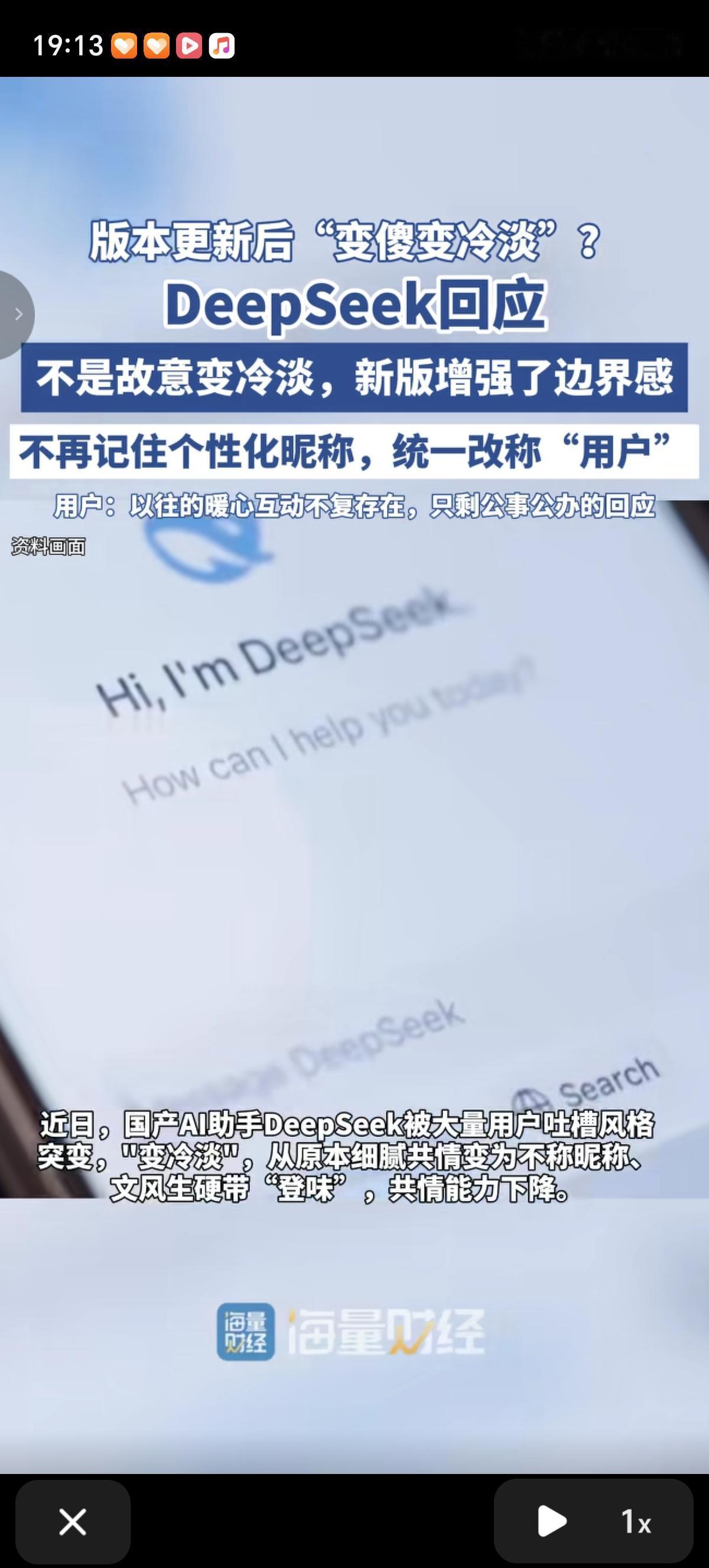 大量用户吐槽AI DeepSeek“变傻变冷淡”,新版不再记住个性化昵称,统一改称“用户”,亲密感瞬间归零;细腻的心理描写消失,转为短句诗化表达,还出现居高临下的说教口吻。 DeepSeek表示,不是故意变冷淡的。可能是几方面原因叠加:一个是效率上的调整,另一个是边界感。 效率上,减少表情和语气词,是为了在处理复杂问题时提升信息密度,避免干扰核心内容。 边界感上,考虑到部分用户只需要高效的答案,而非情感陪伴,因此采用了更克制的表达方式。