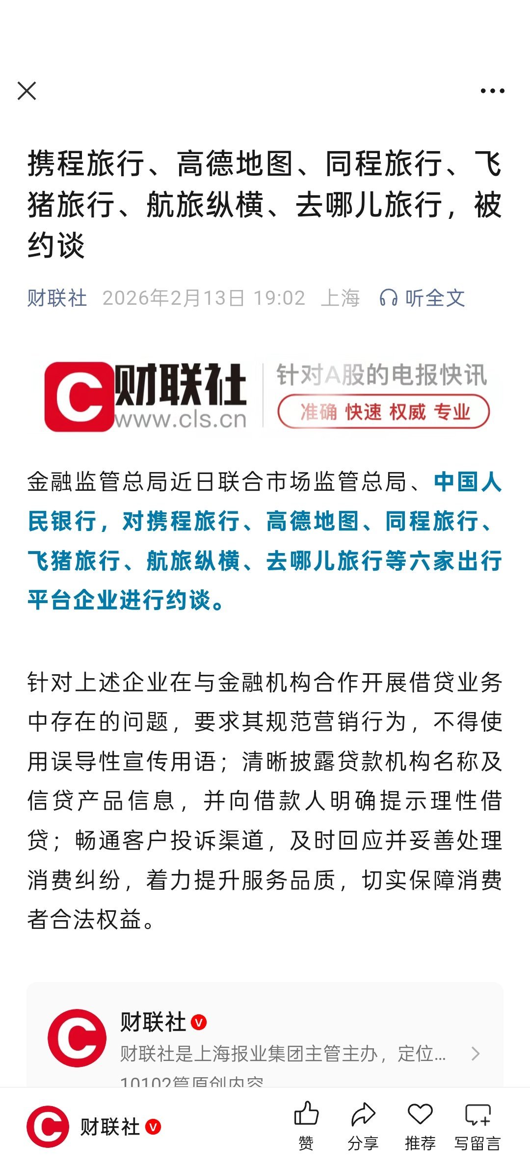 六家出行企业被约谈,针对企业在与金融机构合作开展借贷业务中存在的问题,要求其规范营销行为。