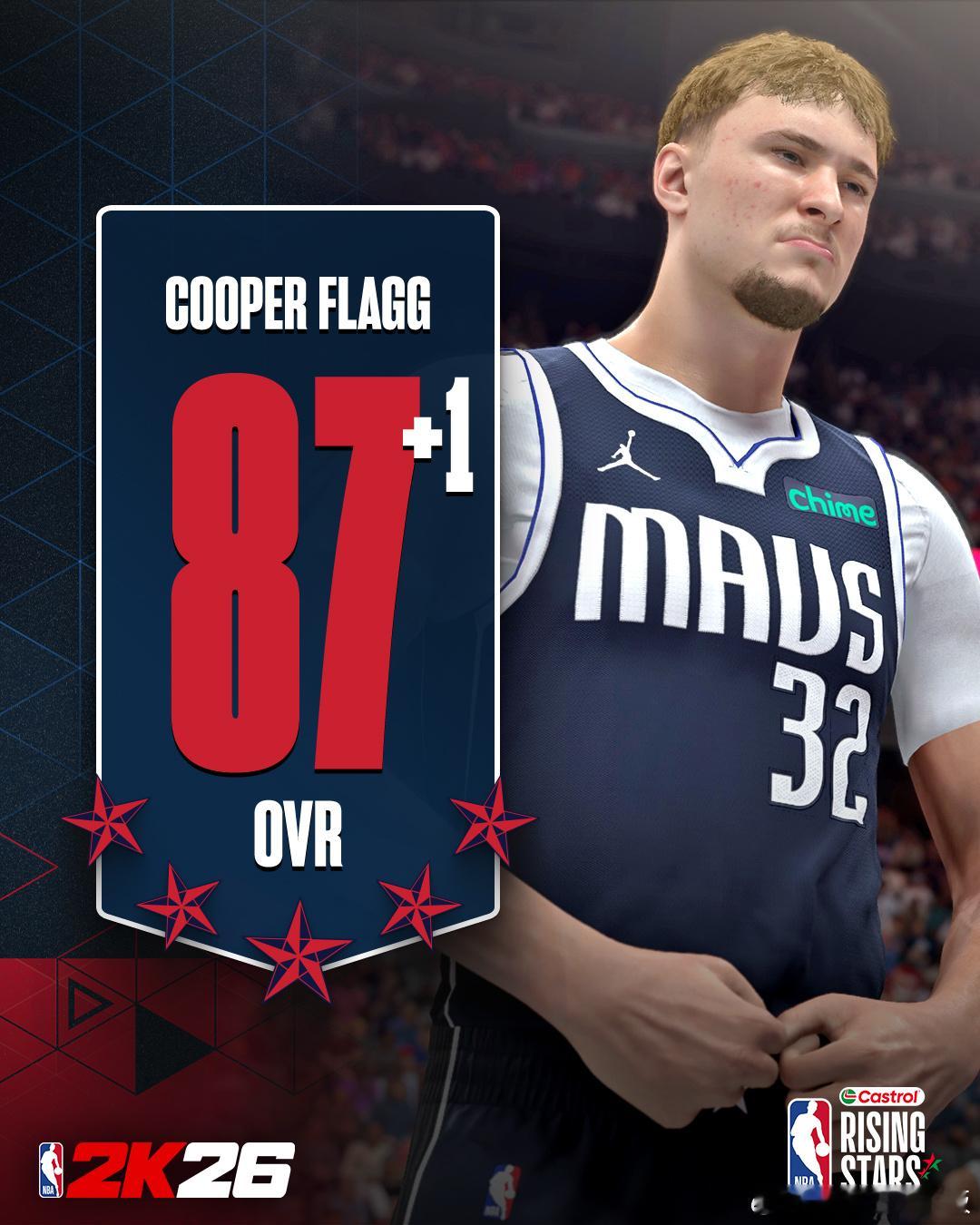 NBA2K26进行赛季球员能力值第7次更新,能力值提升的主要球员有: 恩比德92,弗拉格87,鲍威尔86,狄龙85,卡斯尔85。
