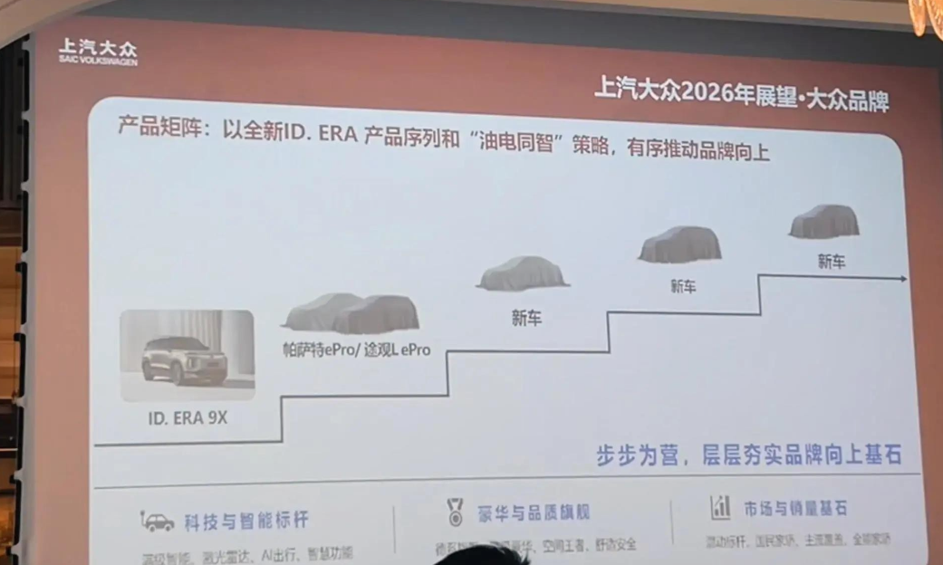 新能源市场热得发烫,1月新能源汽车销量占比已超40%,需求还在猛涨。上汽大众过去两年憋大招,从内部大调整到战略落地,现在终于集中爆发。ID.ERA 9X这台大六座增程SUV最先杀到,纯电能跑超400公里,日常通勤零油耗,长途靠1.5T增程器顶上,彻底告别里程焦虑;智能驾驶还找Momenta合作,宁波工厂已经在预生产,一季度就能买到。 经典老将也没落下,帕萨特和途观L直接上ePro插混版,省油又省钱,保留原来空间和操控优势。另外三款大众新车和奥迪E7X中大型纯电SUV也会陆续亮相,E7X轴距超3米、800V快充、续航最高751公里、零百4.9秒,家用商务两不误。 上汽大众这步棋下得准:不赌单一技术,而是全覆盖用户真实场景,从家用多人到高端商务,从短途到长途都照顾到。合资品牌新能源以前总被说慢半拍,现在靠多动力+高兼容平台弯道超车,性价比直接拉满。 你最期待哪款车落地?来聊聊你的换车打算。