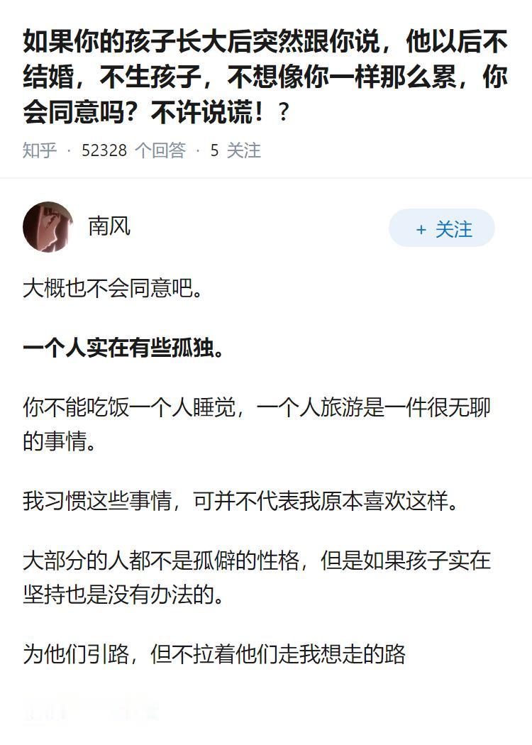 如果你的孩子长大后突然跟你说,他以后不结婚,不生孩子,不想像你一样那么累,你会同意吗?不许说谎!?