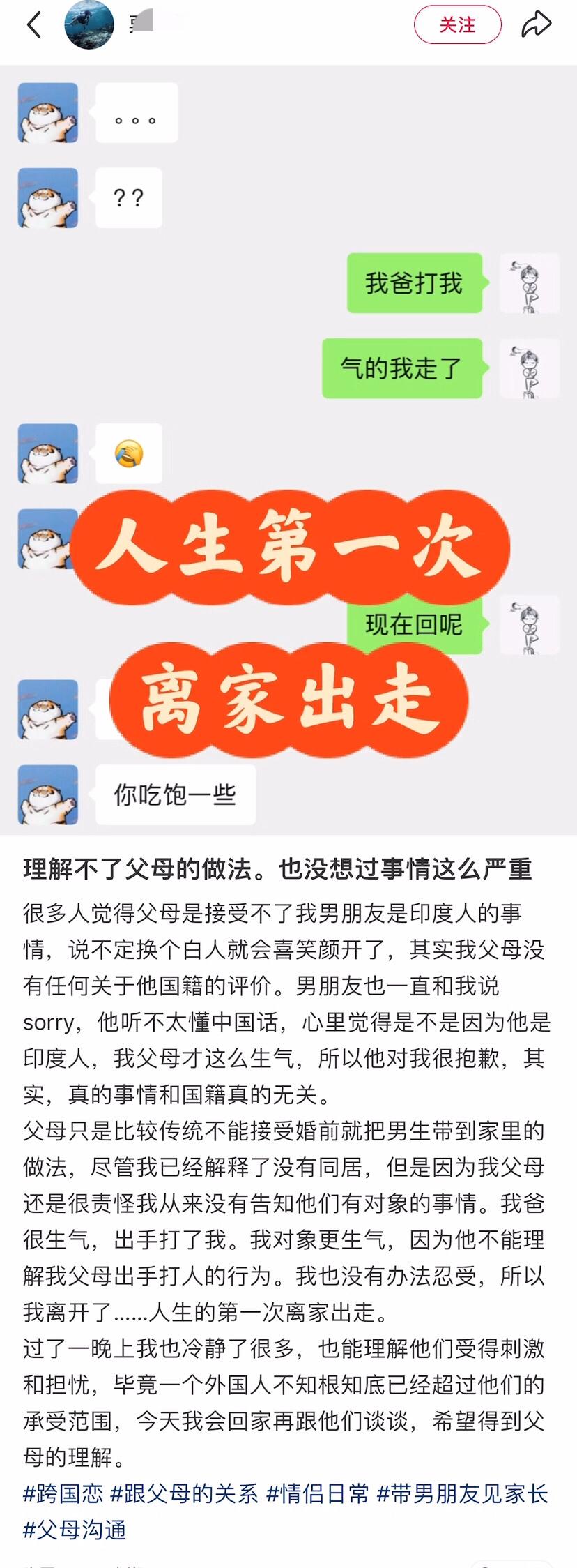看情况是超爱的,尊重他人命运… 好久没见女儿了,想她,偷偷给她一个惊喜! 敲开门后:你是谁?😱 这不一位女网友谈了一个印度男友,结果被突然上门的父母撞见了,之后女网友和父母发生了争执,还被爸爸打了,一气之下离家出走… 不过“跳进黄河洗不清”是不是用错地方了,本身就是事实,这能用在撒谎上吗,搞得你还挺无辜的,通篇语气父母就像外人一样… 理解父母,这换谁谁受得了…