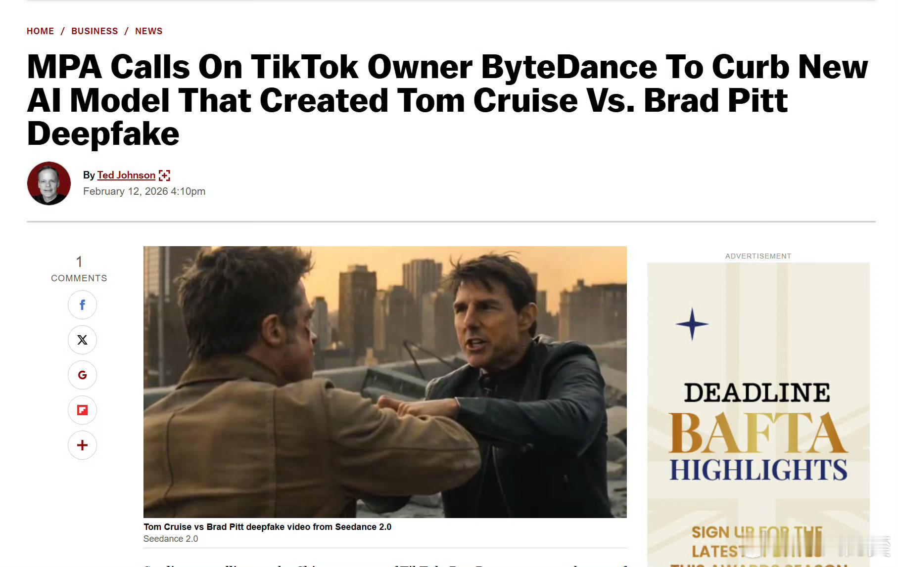 现在正搁外边警告字节跳动的Seedance 2.0大规模侵权。理由是「大量受版权保护的作品被未经授权使用」。
