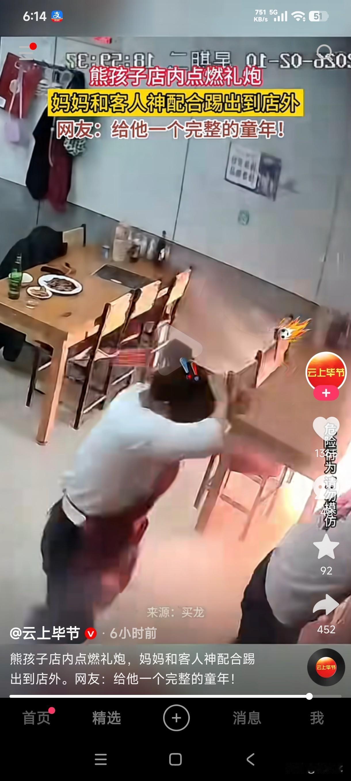 熊孩子店内点燃礼炮 妈妈和客人神速配合 刚踢到店外就嘭的一声响了 这幸亏发现及时 要不然非得酿成大祸不可 这孩子必须要给他一个完整的童年 要不然他不长记性以后肯定会惹出大祸来 孩子闯祸就是大人的责任 真不敢想象这礼炮如果在店里响了 万一发生火灾到时候救都来不及了 孩子不教育不成器 树苗不剪不直溜