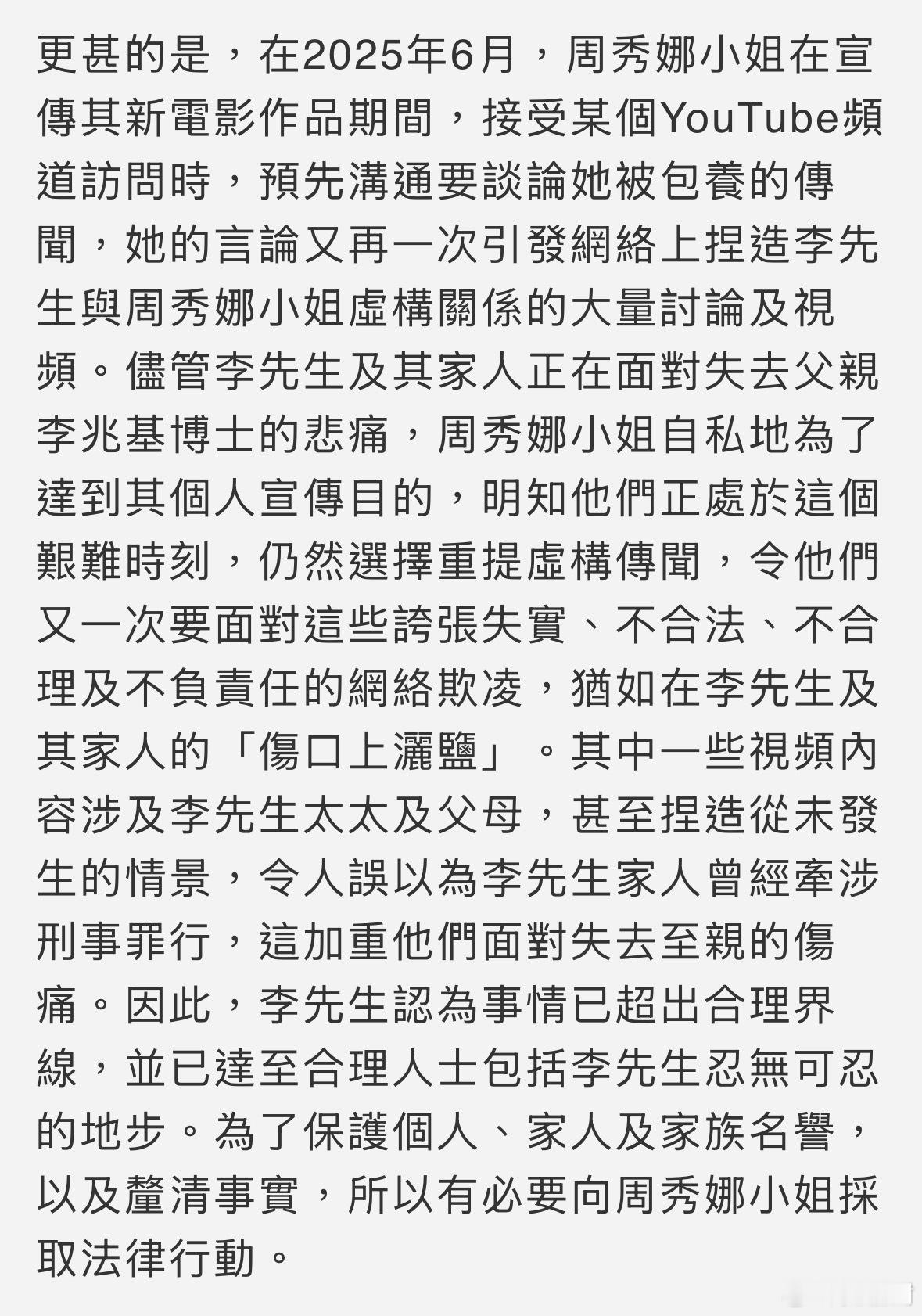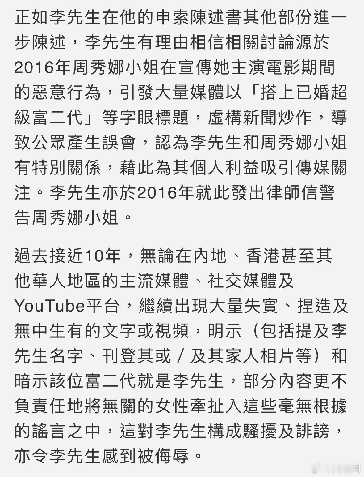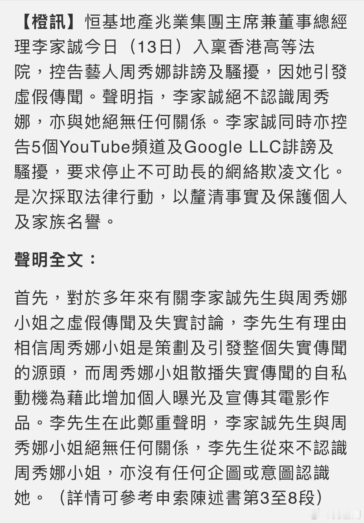 恒基地产兆业集团主席兼董事总经理李家诚今日(13日)入禀高院控告艺人周秀娜诽谤及骚扰,因她引发虚假传闻,声明指李家诚绝不认识周秀娜,亦与她绝无任何关系。李家诚告周秀娜诽谤及骚扰港闻