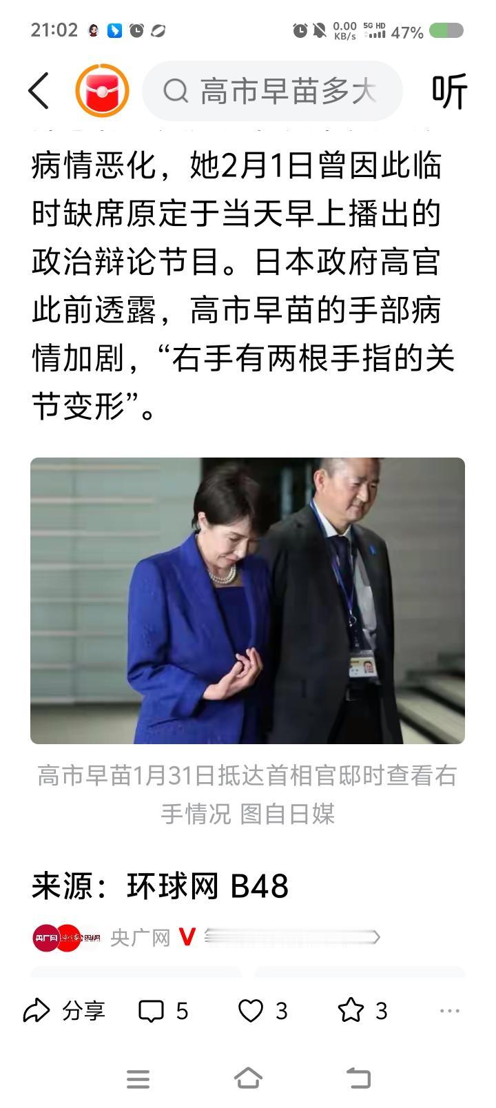高市早苗病了?—— 据报道,高市早苗病情恶化。她手上患类风湿关节炎。 点评: 就这? 要不,全身扫描一下?万一漏了啥病呢。能让十几亿人恨的人,不多。应该给她发个奖:中日友谊破坏奖!