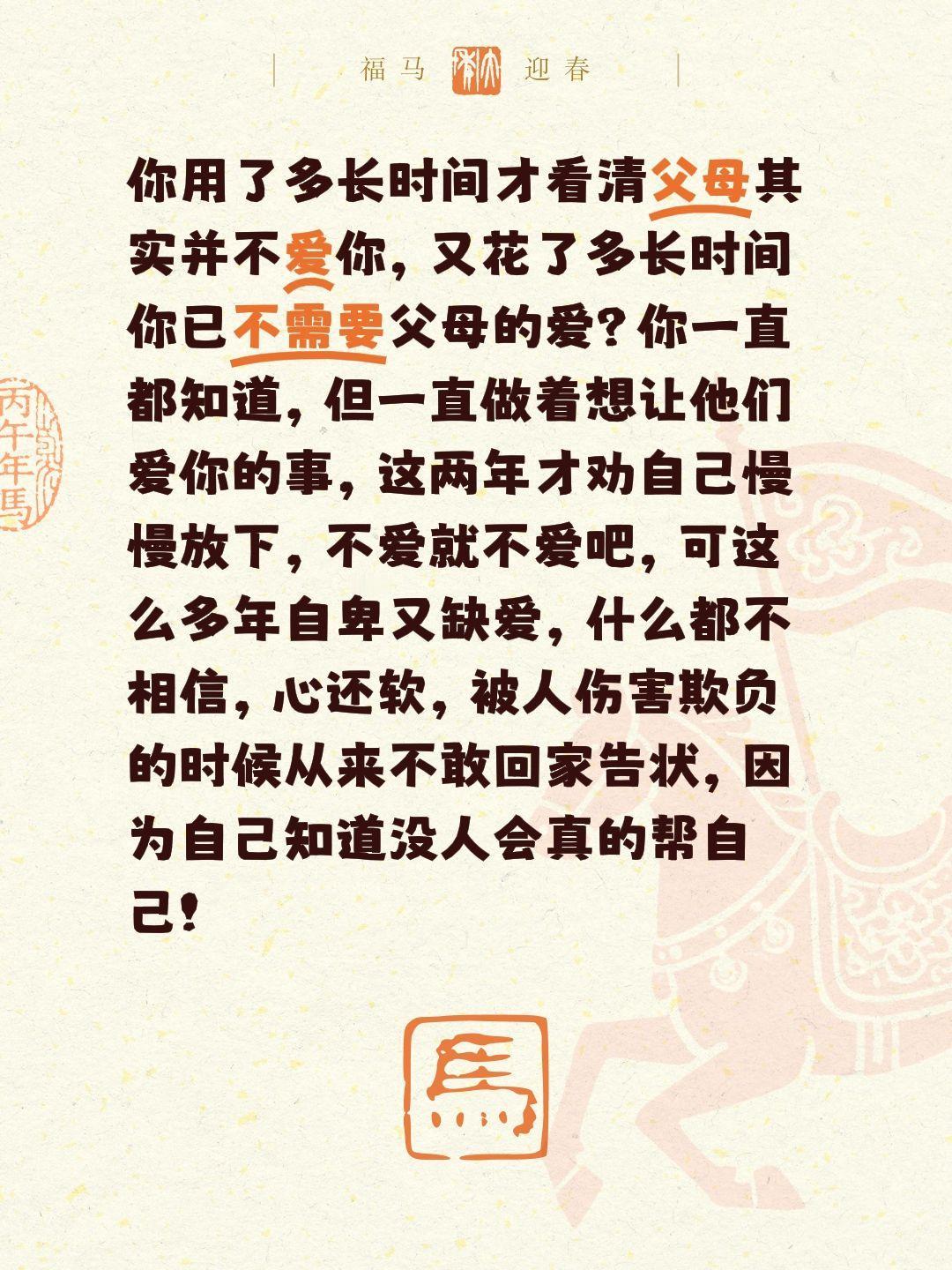 你用了多长时间才看清父母其实并不爱你,又花了多长时间你已不需要父母的爱?你一直都知道,但一直做着想让他们爱你的事,这两年才劝自己慢慢放下,不爱就不爱吧,可这么多年自卑又缺爱,什么都不相信,心还软,被人伤害欺负的时候从来不敢回家告状,因为自己知道没人会真的帮自己!