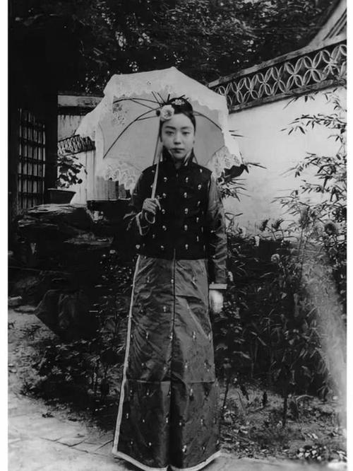 这张照片是晚清时期一位满族贵族女子的珍贵留影,女子站姿优雅,直视镜头,显然是在精心摆拍,这在当时是一种非常“洋气”的行为。 她身着传统的旗装马甲和长裙,发型精致,还点缀着花朵,是当时满族女性的典型装扮。这张照片拍摄于清末民初,正是西方文化大量涌入中国的时代。 她手中的蕾丝边西洋伞,是当时非常时髦的“洋玩意儿”。在那个时代,这种伞不仅是遮阳避雨的工具,更是身份和品味的象征,代表着对西方生活方式的向往和接纳。