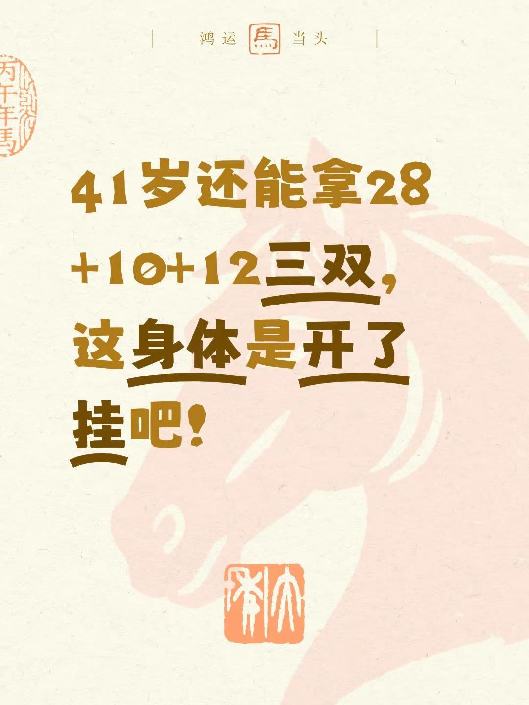 詹姆斯三双。41岁还能拿28+10+12三双,这身体是开了挂吧!40岁依然保持好