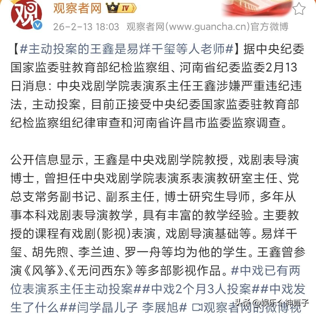 中戏表演系主任自动投案,曝闫学晶三位亲属都在中戏! 2月13日,看到两个热搜,第一个,中戏表演系主任自动投案,第二个,曝闫学晶三位家属都在中戏,当然,两者没有必然联系。 据媒体报道,这个主动投案的王鑫,还是易烊千玺、李兰迪、罗一舟等的老师,这几位明星的演技都不错,所以说,也算是桃李满天下,走到这一步,让人感到惋惜。 一位博主爆料,称闫学晶的三位亲属都就读于中戏表演系,包括儿子林傲霏、继女林傲雪、侄子闫浩博。 看了视频,这位博主的大概意思,觉得中戏很难考,因此质疑三人个人都能考入这个学府,到底有多厉害。 其实,此前网上就质疑林傲霏的入学问题,不过,学校回应了,网络传闻不实。 说实话,三个亲人都就读于中戏,网友有质疑,可以理解,不过,不排除本身学习就很优秀,另外,家庭条件好,如果给孩子请名师指导,肯定不一样,也很正常。 总之一句话,学会理性吃瓜,网上爆料未必可信。