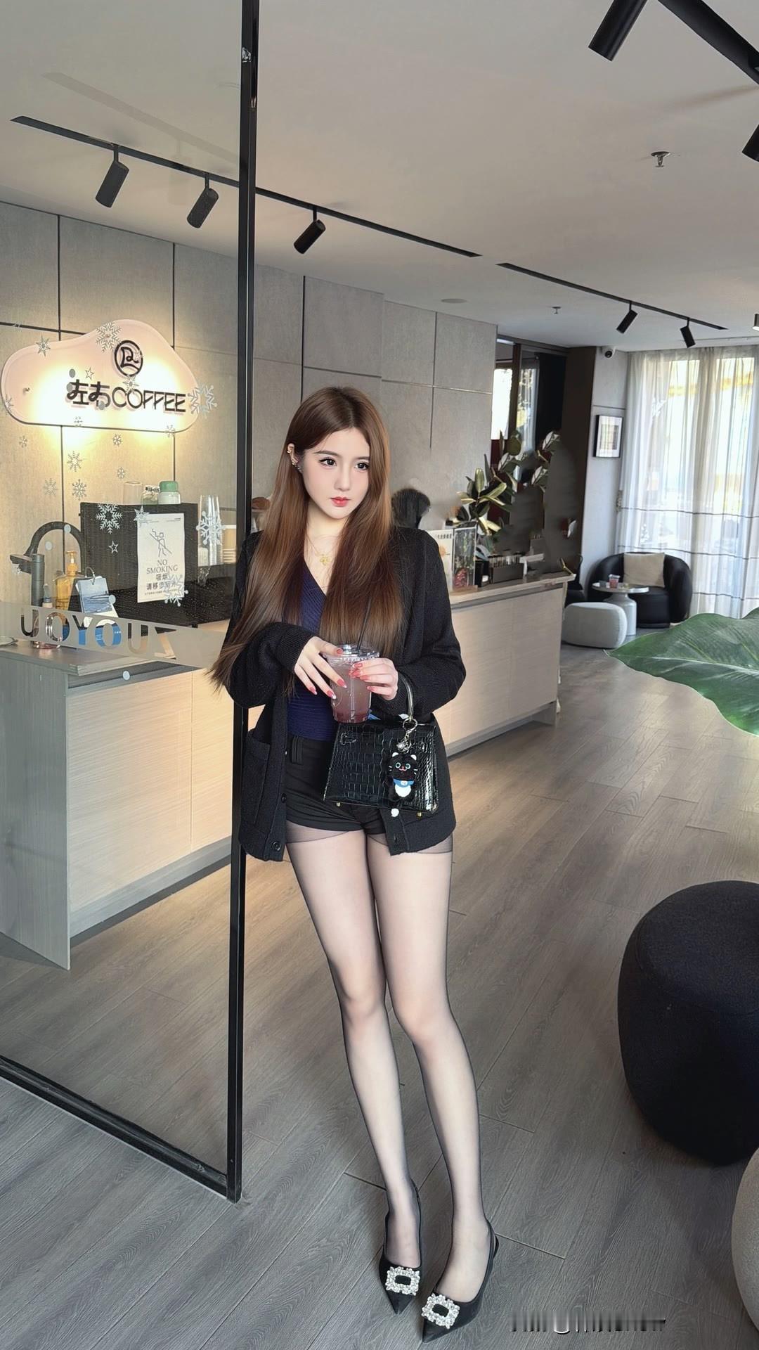 优雅咖啡馆里的时尚少女,黑裙配高跟鞋,尽显魅力!大长腿 漂亮小姐姐 温柔咖啡店美女