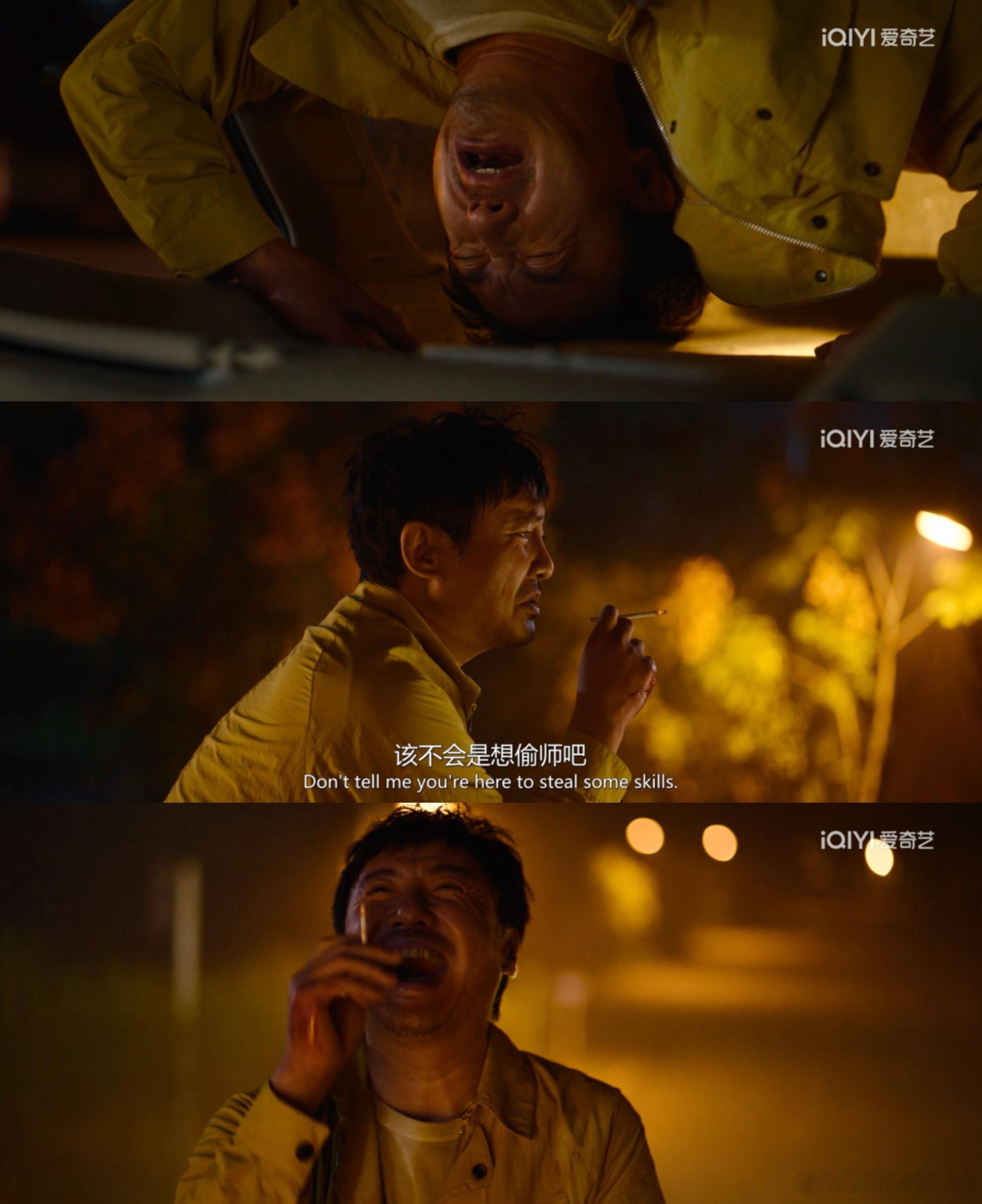 两人坐在石墩上抽烟聊天时,张弛强装不在乎,还故作坚强的来了一句“该不会想偷师吧”来化解尴尬。