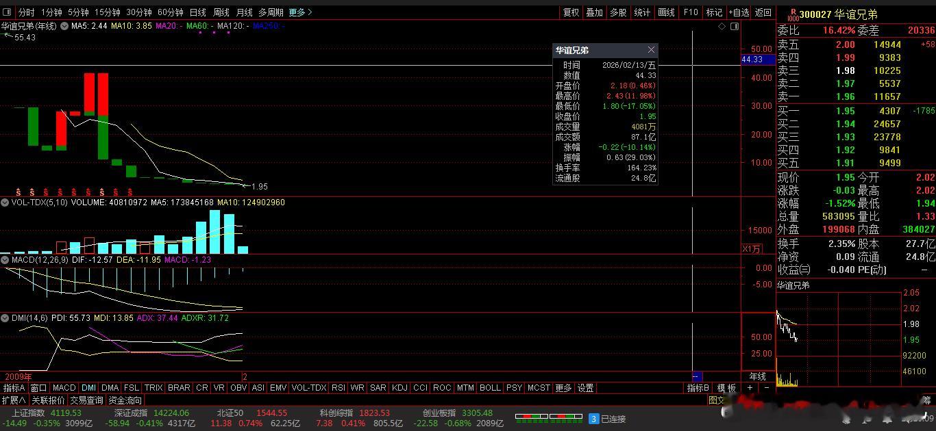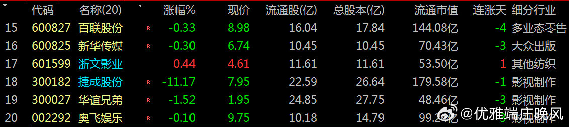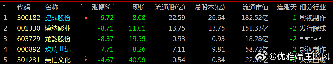 今日午盘:市场数据,强势特征。少数个股:弱不禁风:高位跳水:捷成股份、华谊兄弟、华策影视等个股出现大幅下跌,主要受业绩预亏、资金集中流出及市场情绪分化等因素影响,而非单一政策刺激所致。今天透视:行业弱股。