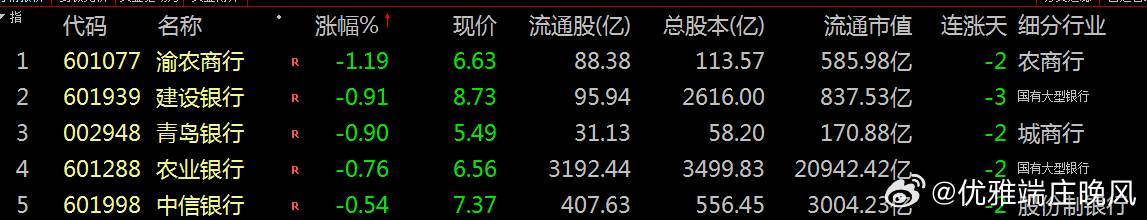 分别是:涨跌版、现价、流通股、总股本、流通市值、连涨天数、细分行业等排列。