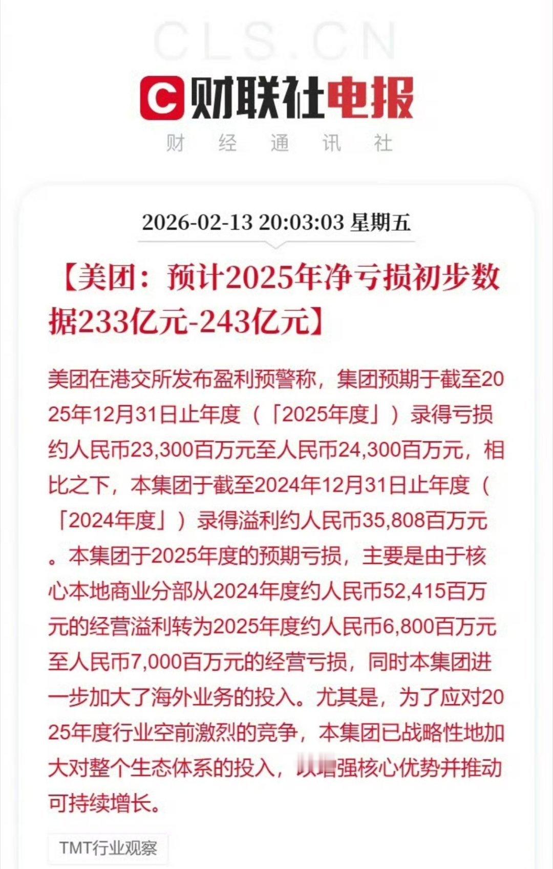 美团哥真的惨啊。刚发的预亏公告,2025年一把亏掉233—243个亿。202