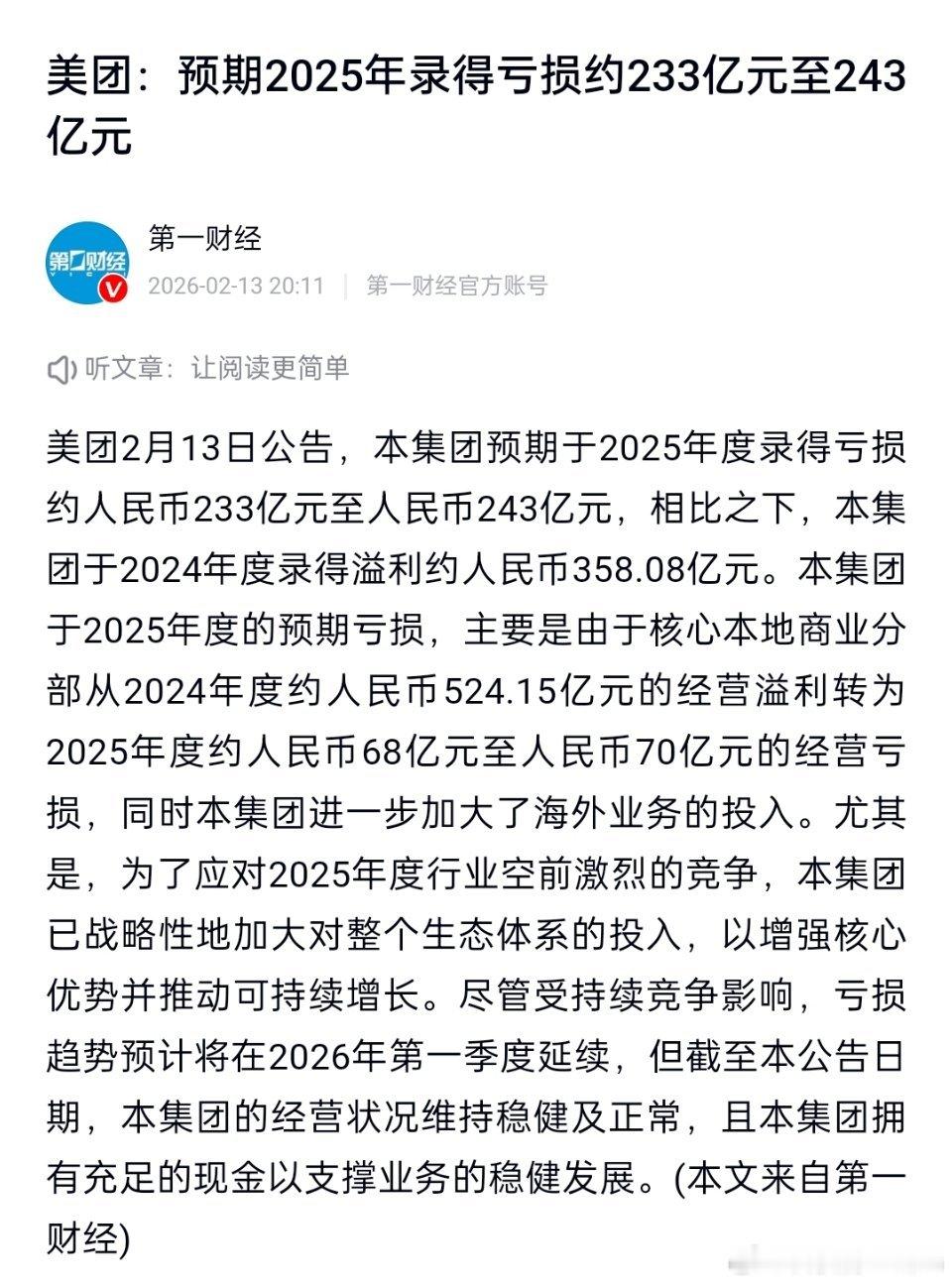🔻外卖大战太卷了,美团直接亏了200亿!美团预计净亏损233亿至243亿