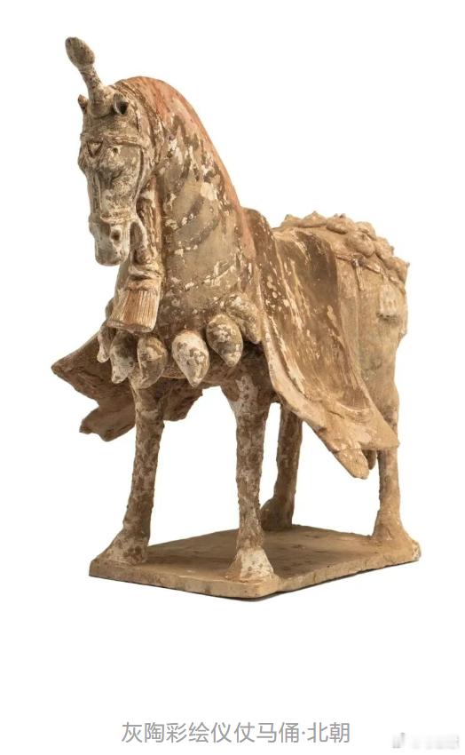 马年看马灰陶彩绘仪仗马俑 来看一匹来自北朝的“仪仗担当”——灰陶彩绘仪仗马俑。它体型饱满、线条舒展,不仅体现了马匹的力量感,更因周身细致的彩绘与装饰,展现出仪式场合的庄重与华美。马具刻画极为完整:头戴络头、衔、镳,胸系缨饰,背披鞍鞯、障泥,臀后拴红鞧带,直观呈现了北朝时期高等级马匹的全套礼仪装备。这类陶俑并非单纯的艺术品,更是研究北朝车马制度、仪仗规范与物质文化的珍贵实物资料。