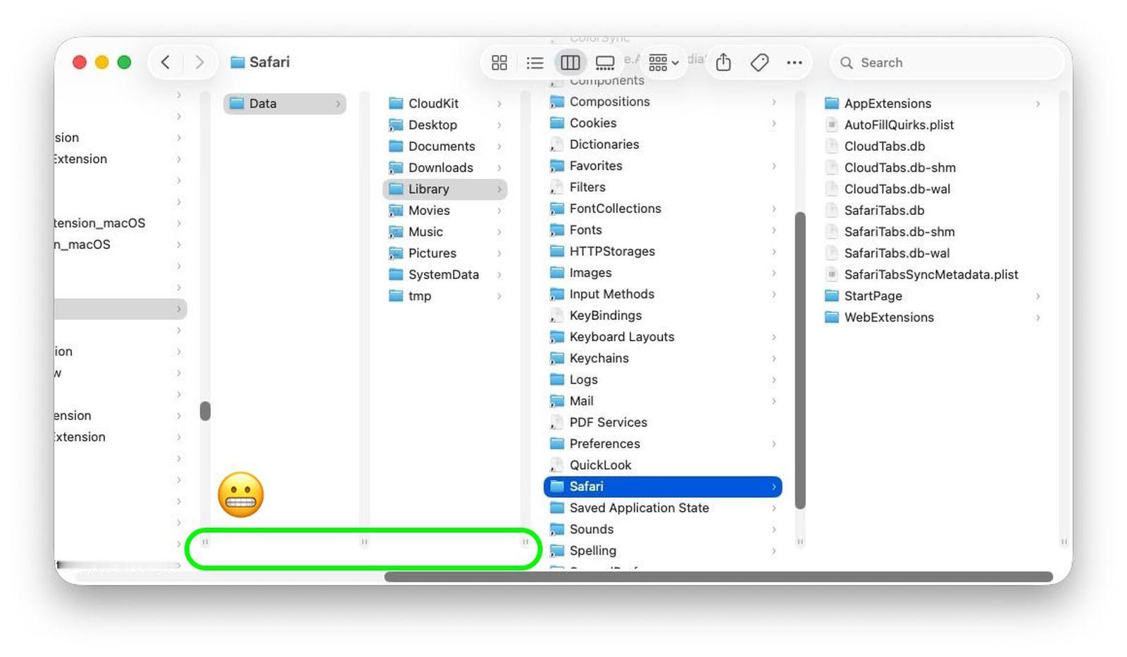 在 Finder 的每个列底部都有方便的调整大小控点,你可以根据需要展开或缩小每一列。但在 macOS 26 和 macOS 26.2 中,当滑动条设置为“始终显示”时,底部的水平滑动条会覆盖这些控点,因此你无法像早期 macOS 版本(例如 macOS Sequoia)中点击它们来调整列宽。