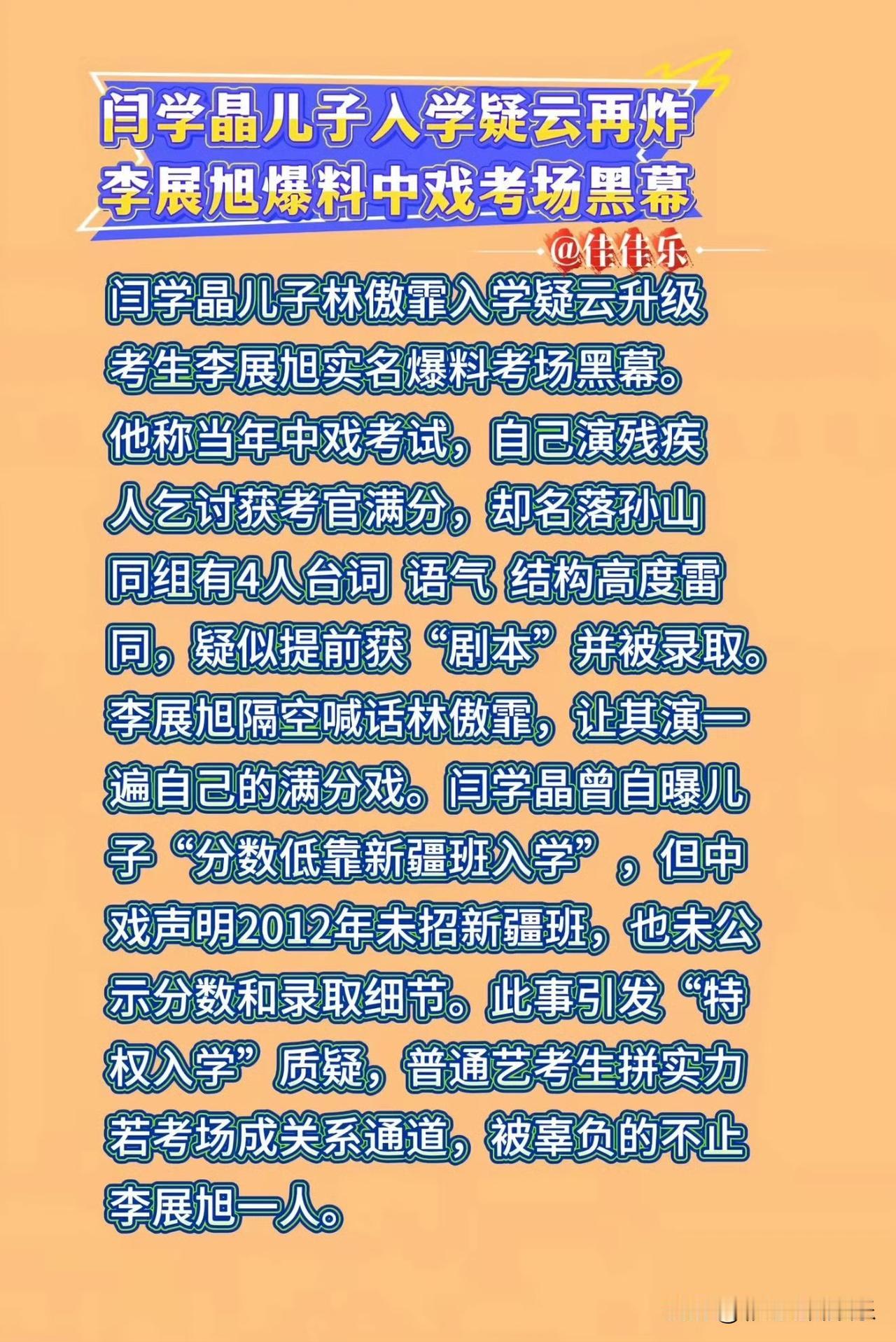 闫学晶儿子原来真的是冒名顶替上的中戏,他的名字叫林傲霏,但是中戏没有林傲霏这个人,只有李展旭。 林傲霏的大学毕业照叫李展旭,而不是林傲霏,闫学晶一家有三个人都考上中戏,不是家里学霸多疑似走了后门。 事出反常必有妖,天狂必有雨人狂必有祸,看来闫学晶哭穷炫富还是其次,深扒下来疑点重重。