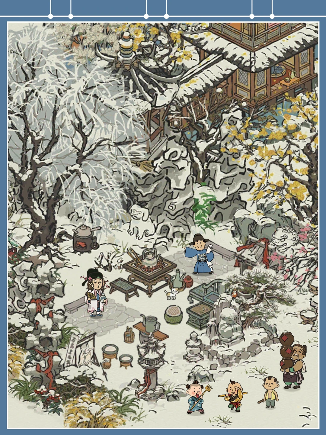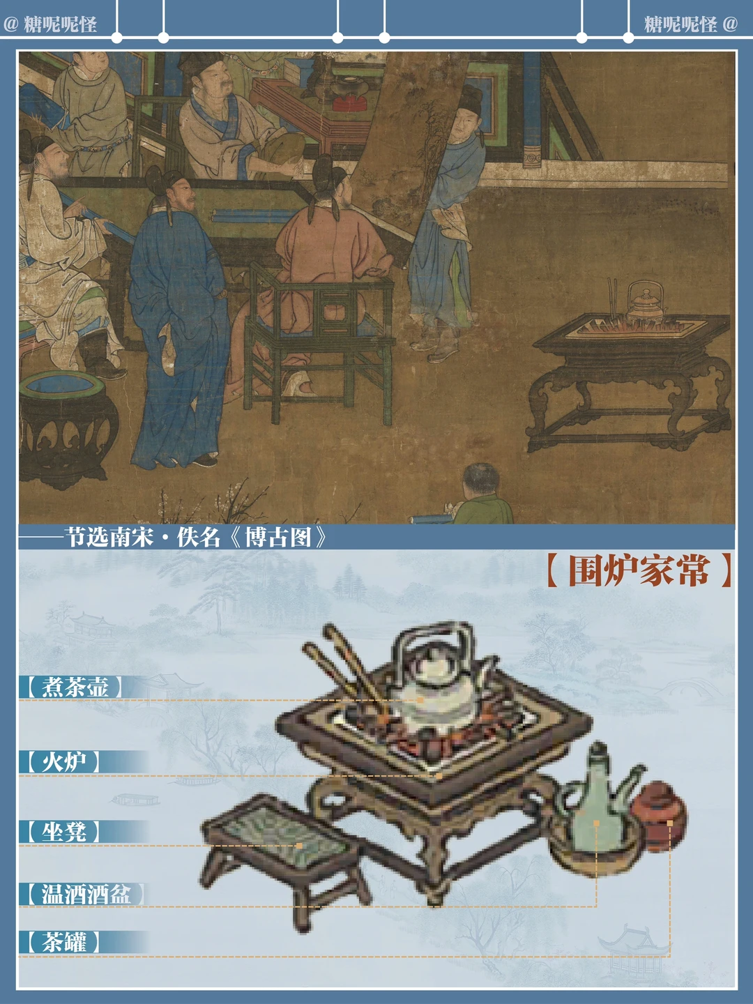 【围炉家常】和【长桌赏画】来自同一幅画作,即南宋《博古图》。小破图的看上去比原画作更和谐一些……