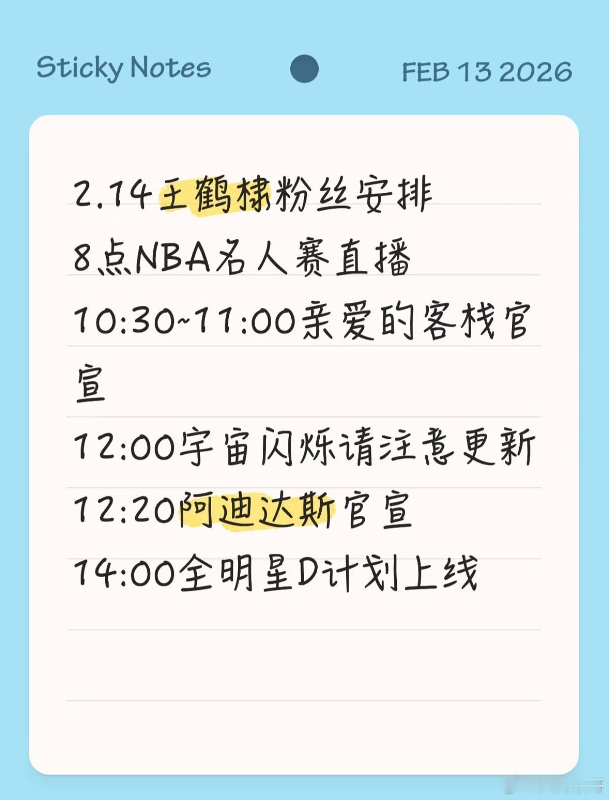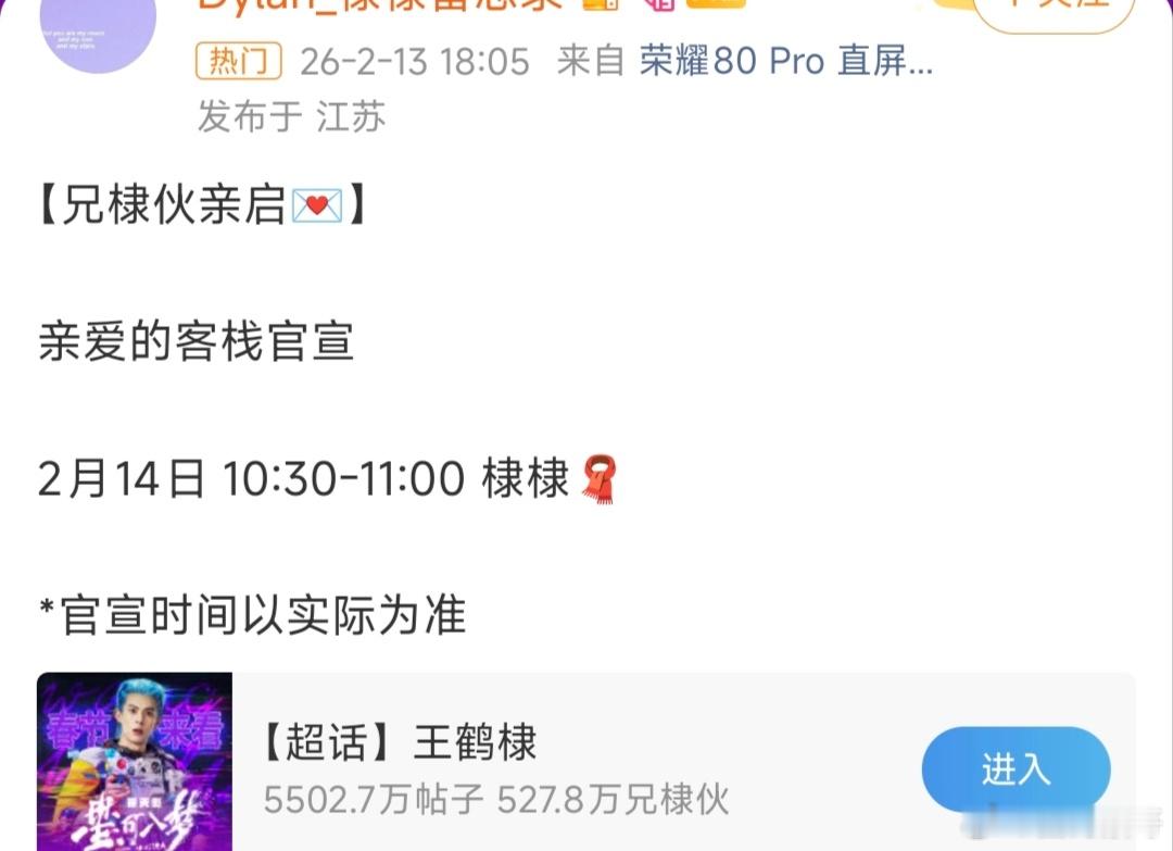 明天情人节不仅王鹤棣本人有新代言和亲爱的客栈要官宣,连兄棣伙都有行程了,从早上到
