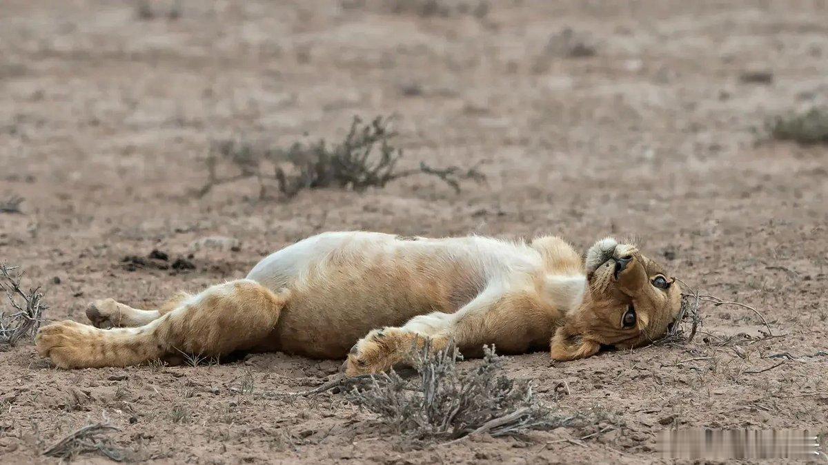 摄影师约翰·J·博塔当时正在拍摄一个相当庞大的狮子家族——共有九只,其中包括几只幼崽——的猎杀现场。所有狮子都吃得饱饱的,突然这只吃撑了的幼狮仰面倒下……看着他。