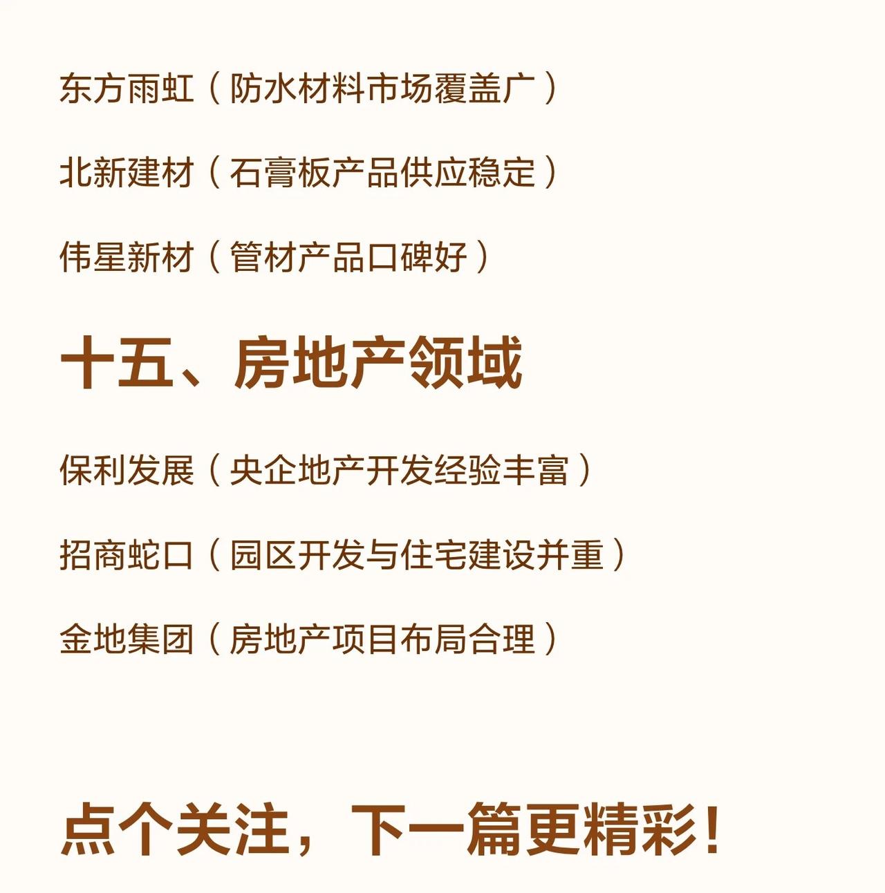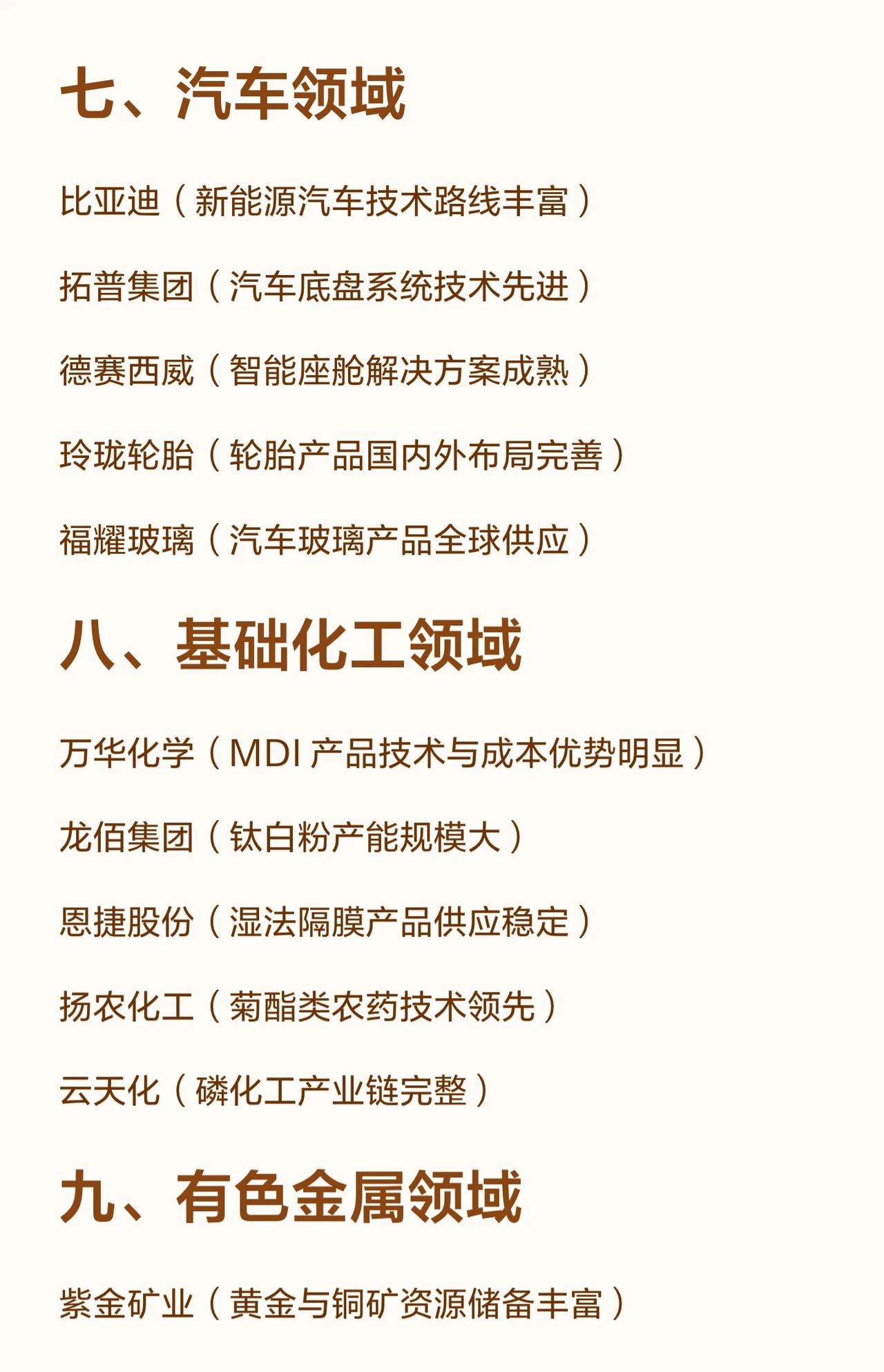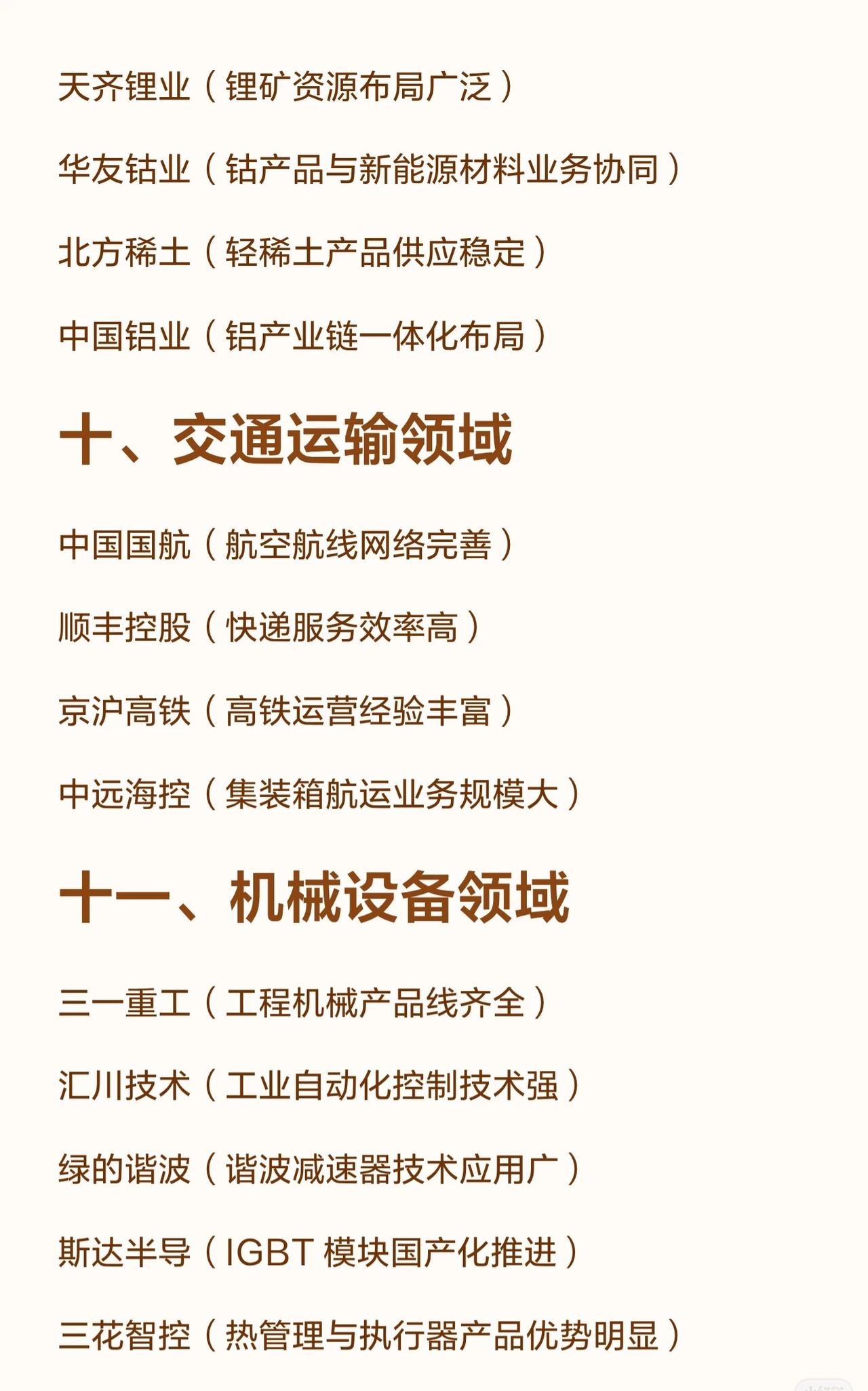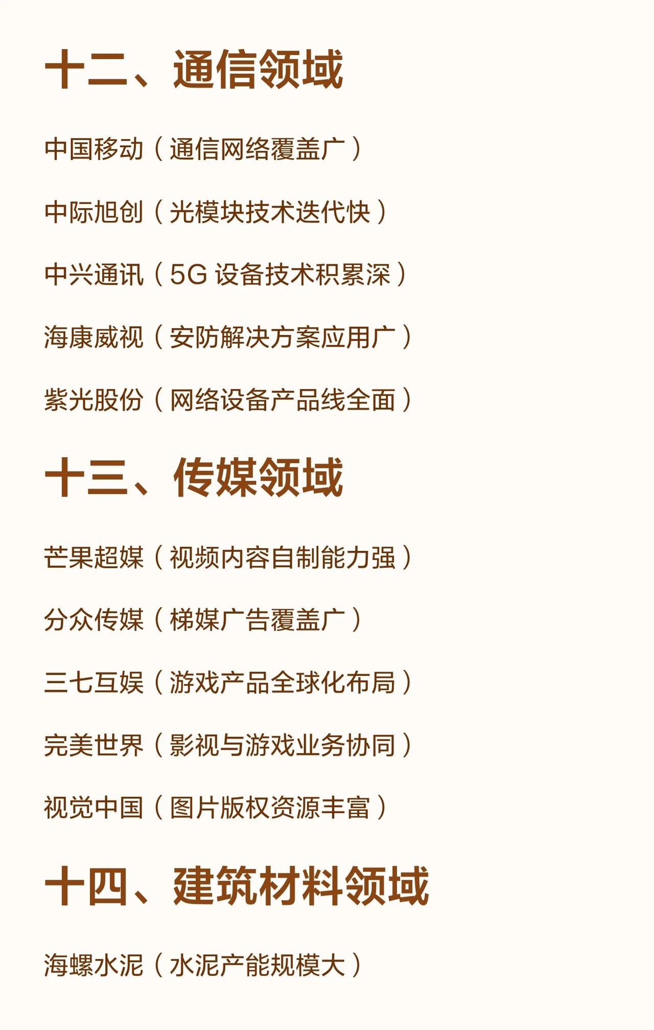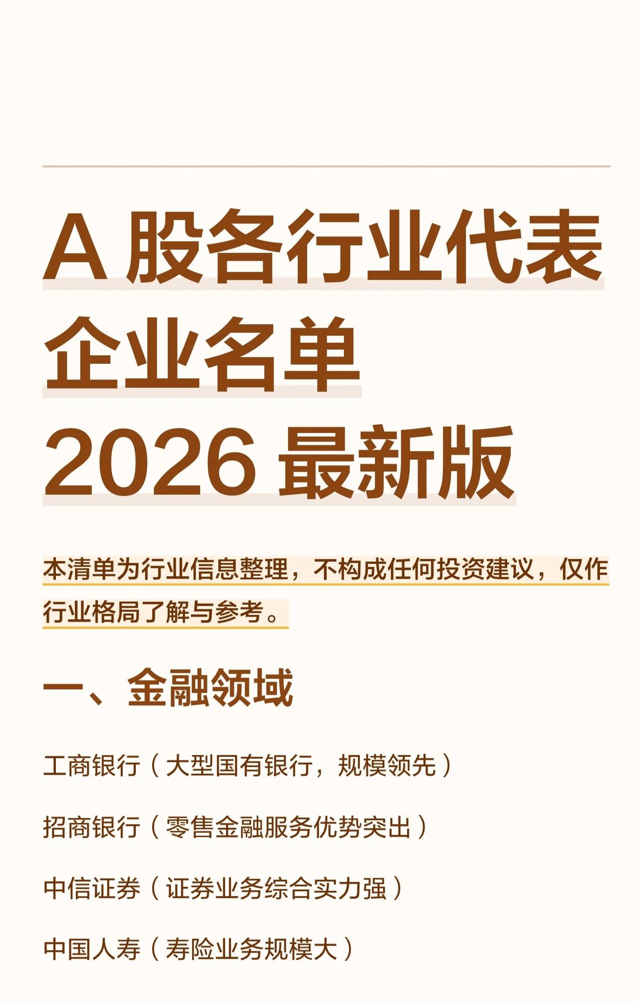 以下内容为《A股各行业代表企业名单2026最新版》的文字信息汇总,明确说明“本清单为行业信息整理,不构成任何投资建议,仅作行业格局了解与参考”。具体如下: 1. 金融领域 工商银行(大型国有银行,规模领先)、招商银行(零售金融服务优势突出)、中信证券(证券业务综合实力强)、中国人寿(寿险业务规模大)。 2. 食品饮料领域 贵州茅台(酱香型白酒知名品牌)、伊利股份(乳制品市场覆盖广)、海天味业(调味品品类丰富)、青岛啤酒(国产啤酒市场认可度高)。 3. 医药生物领域 迈瑞医疗(医疗器械产品线完善)、恒瑞医药(创新药研发投入持续)、药明康德(药物研发服务全球化布局)、智飞生物(疫苗产品矩阵丰富)、片仔癀(传统中药特色产品)。 4. 电气设备与新能源领域 宁德时代(动力电池与储能电池技术积累深)、隆基绿能(光伏组件与单晶硅片业务成熟)、阳光电源(逆变器与储能业务发展快)、国电南瑞(智能电网设备技术先进)、金风科技(风电整机制造经验丰富)。 5. 电子领域 中芯国际(国内晶圆代工技术领先)、工业富联(电子制造服务规模大)、卓胜微(射频芯片国产化推进中)、鹏鼎控股(消费电子PCB供应稳定)、京东方A(LCD面板产能与技术优势明显)。 6. 计算机领域 浪潮信息(服务器市场占有率高)、启明星辰(网络安全产品线全面)、卫宁健康(医疗信息化服务覆盖广)、科大讯飞(智能语音技术应用广)。 7. 汽车领域 比亚迪(新能源汽车技术路线丰富)、拓普集团(汽车底盘系统技术先进)、德赛西威(智能座舱解决方案成熟)、玲珑轮胎(轮胎产品国内外布局完善)、福耀玻璃(汽车玻璃产品全球供应)。 8. 基础化工领域 万华化学(MDI产品技术与成本优势明显)、龙佰集团(钛白粉产能规模大)、恩捷股份(湿法隔膜产品供应稳定)、扬农化工(菊酯类农药技术领先)、云天化(磷化工产业链完整)。 9. 有色金属领域 紫金矿业(黄金与铜矿资源储备丰富)、天齐锂业(锂矿资源布局广泛)、华友钴业(钴产品与新能源材料业务协同)、北方稀土(轻稀土产品供应稳定)、中国铝业(铝产业链一体化布局)。 10. 交通运输领域 中国国航(航空航线网络完善)、顺丰控股(快递服务效率高)、京沪高铁(高铁运营经验丰富)、中远海控(集装箱航运业务规模大)。 11. 机械设备领域 三一重工(工程机械产品线齐全)、汇川技术(工业自动化控制技术强)、绿的谐波(谐波减速器技术应用广)、斯达半导(IGBT模块国产化推进)、三花智控(热管理与执行器产品优势明显)。 12. 通信领域 中国移动(通信网络覆盖广)、中际旭创(光模块技术迭代快)、中兴通讯(5G设备技术积累深)、海康威视(安防解决方案应用广)、紫光股份(网络设备产品线全面)。 13. 传媒领域 芒果超媒(视频内容自制能力强)、分众传媒(梯媒广告覆盖广)、三七互娱(游戏产品全球化布局)、完美世界(影视与游戏业务协同)、视觉中国(图片版权资源丰富)。 14. 建筑材料领域 海螺水泥(水泥产能规模大)、东方雨虹(防水材料市场覆盖广)、北新建材(石膏板产品供应稳定)、伟星新材(管材产品口碑好)。 15. 房地产领域 保利发展(央企地产开发经验丰富)、招商蛇口(园区开发与住宅建设并重)、金地集团(房地产项目布局合理)。