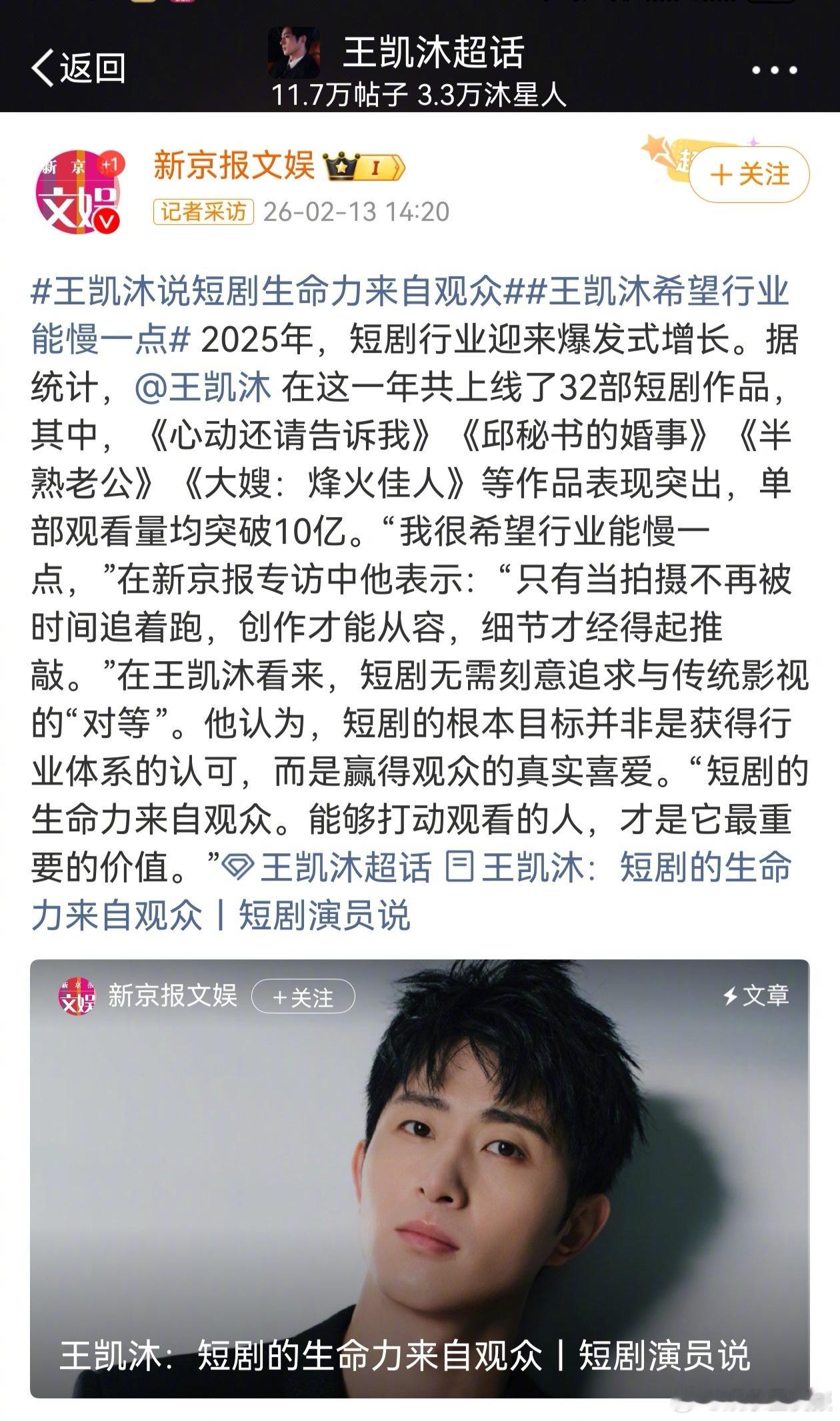 王凯沐说短剧生命力来自观众王凯沐希望行业能慢一点 看完新京报和王凯沐的对话,终于明白他为什么能从模特转型、还在短剧赛道站稳脚跟。他聊选戏标准只有一句“剧本要先打动我”,聊大IP却说“周期紧预算有限,不敢轻易碰”——这不是保守,是知道什么该敬畏。从梁家辉身上学“不被风格束缚”,自己也在一步步用偶像的力量激励和要求自己。采访里更是言之有物,知行合一。在短剧飞速发展的流量池里,能踏踏实实地投身作品,不被流量裹挟,从容真挚地珍视每一位支持他的人,这样的演员不管在什么赛道里都能走出一条自己的花路来。