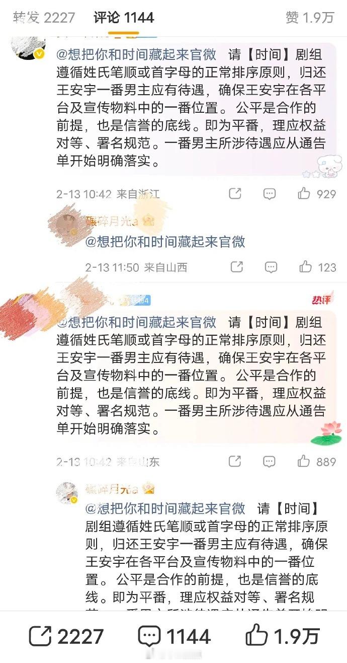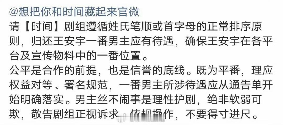 王安宇粉丝要求想把你和时间藏起来剧组官宣原则需以姓氏笔划或首字母正常排序为准,这样官宣王安宇应该都是平一番在前