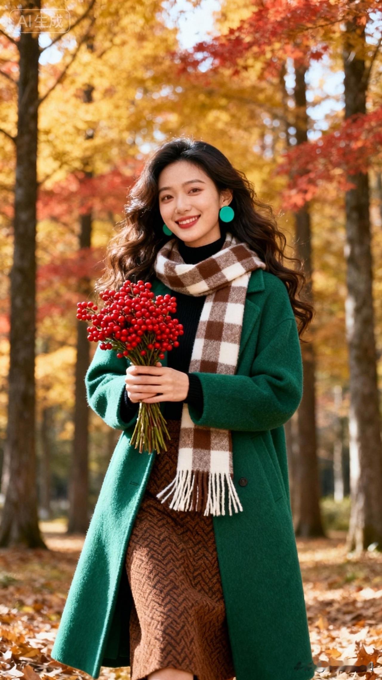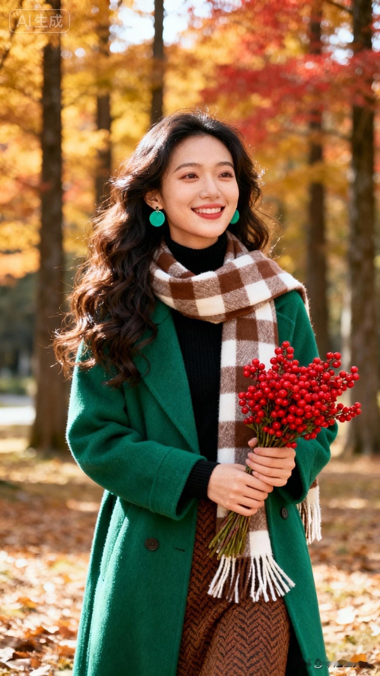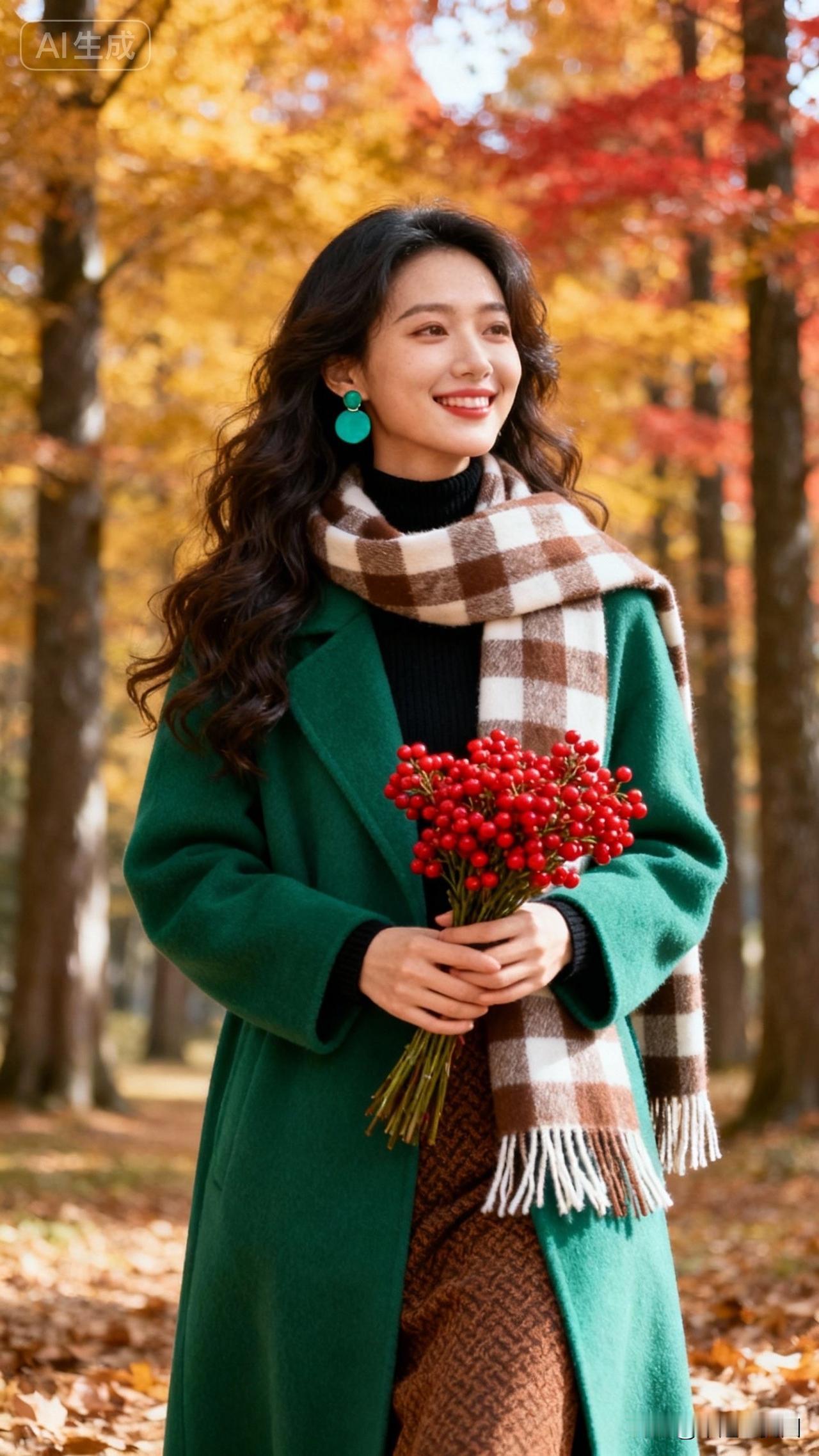 秋日森林里的温暖时光,绿衣少女与红果相伴。