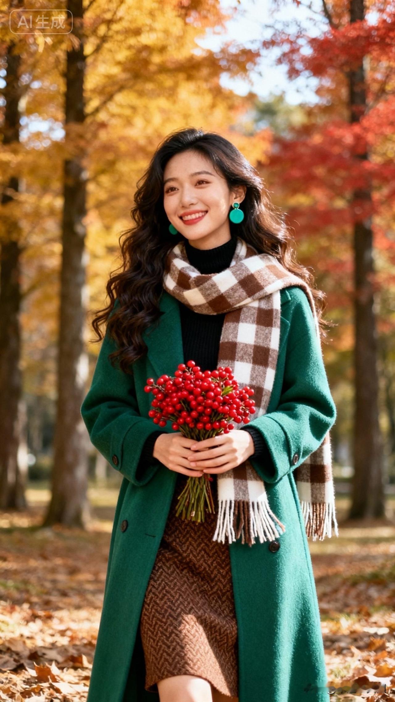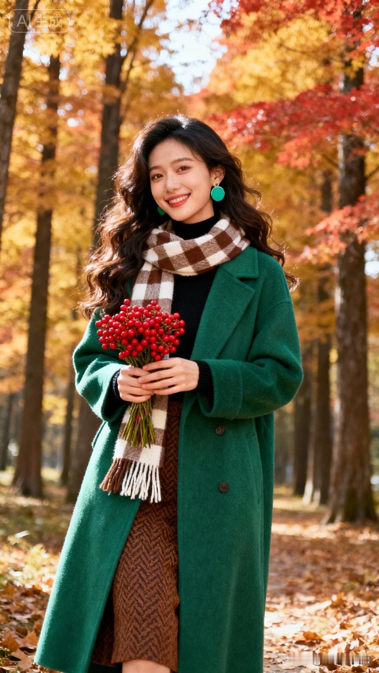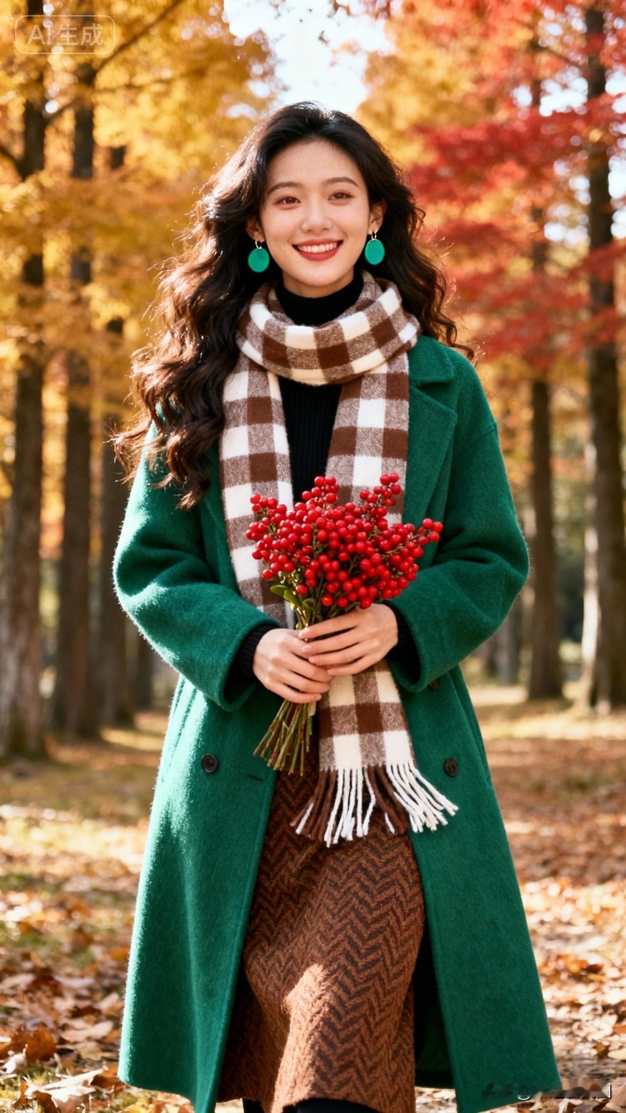 秋日森林里的温暖时光,绿衣少女与红果相伴。