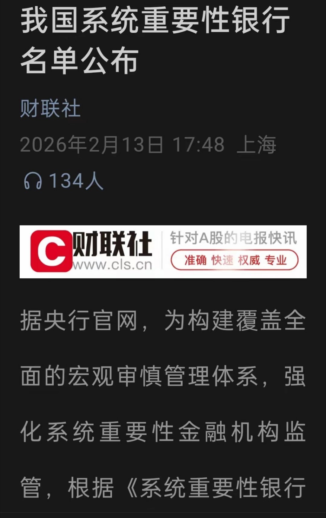 今天A股收市后,央行发布了我国系统重要性银行名单。认定21家为国内系统重要性银行,平安银行,南京银行,兴业银行,浦发银行,工农中建四大银行榜上有名。下一步,中国人民银行,国家金融监督管理总局将按照相关要求,促进系统重要性银行,稳健经营和健康发展,更好服务实体经济高质量发展。A股收市后发布这个名单,对调整多日的银行股,会是一个大利好吗?会不会是鼓励大家开心消费,节后大红包补发?
