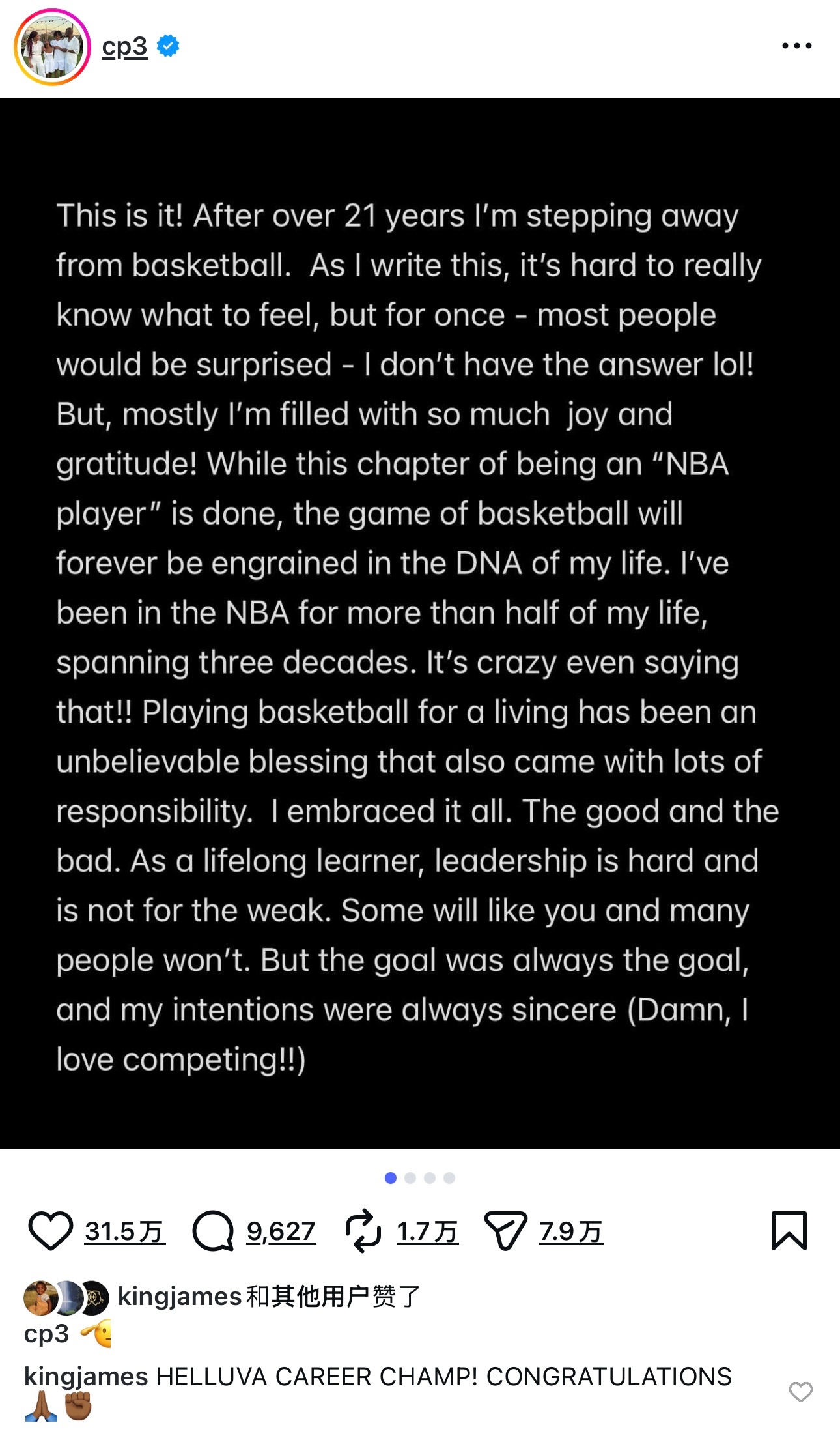 保罗在社媒宣布自己退役的决定,詹姆斯点赞并留言:“传奇生涯,冠军!恭喜你🙏?