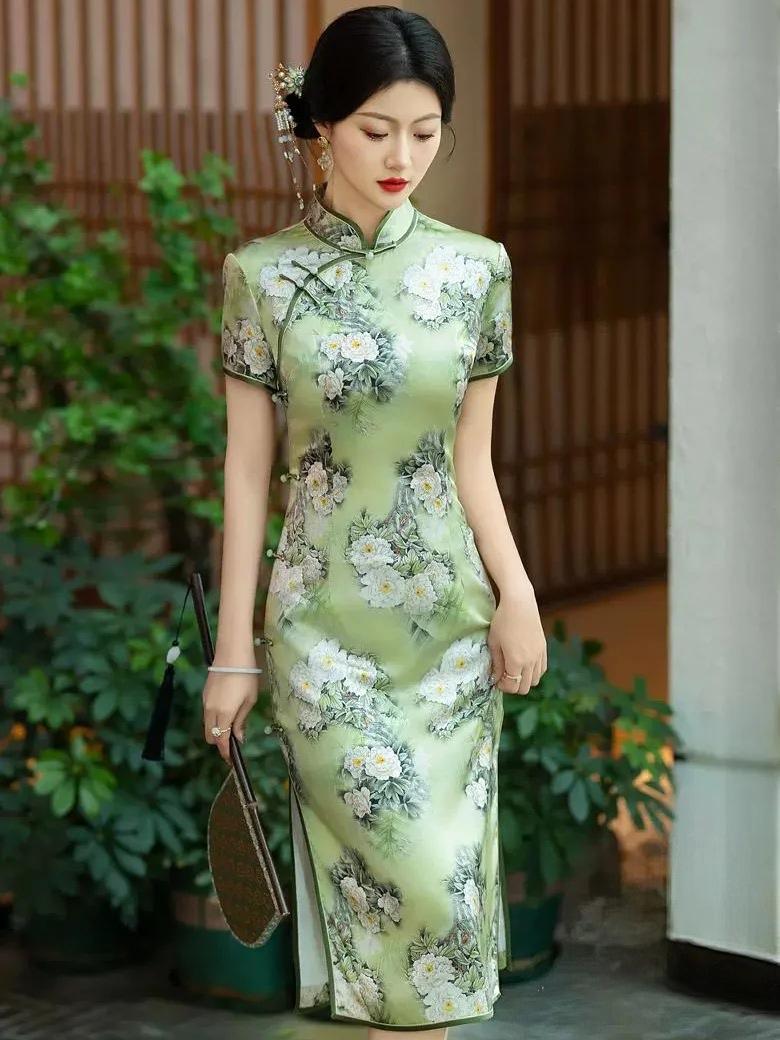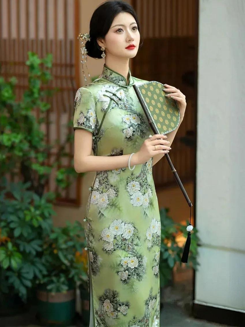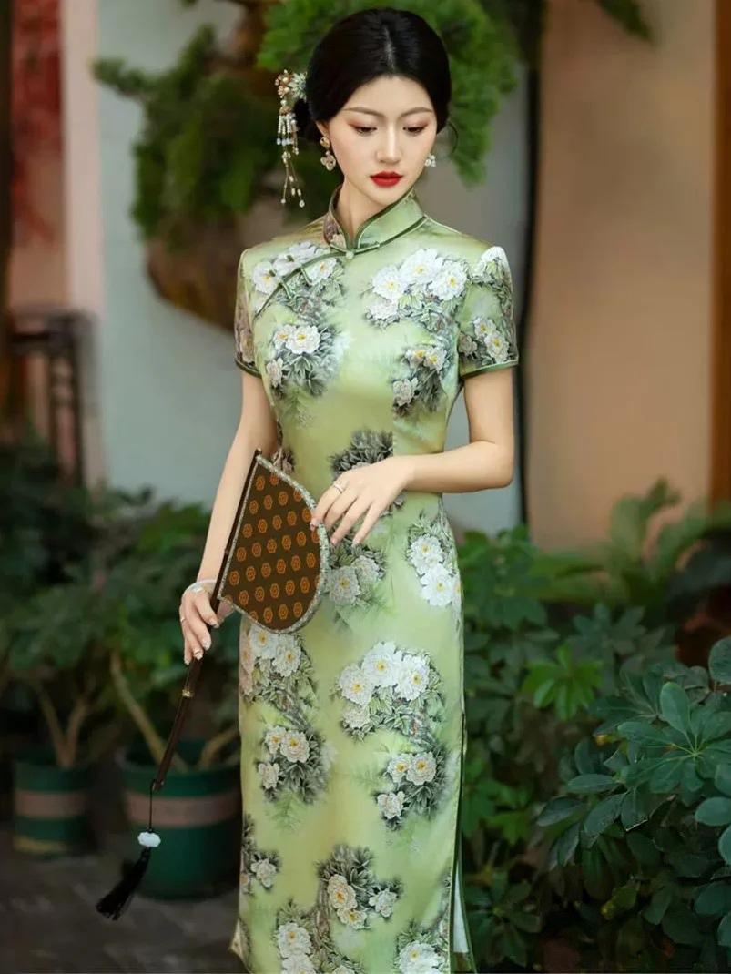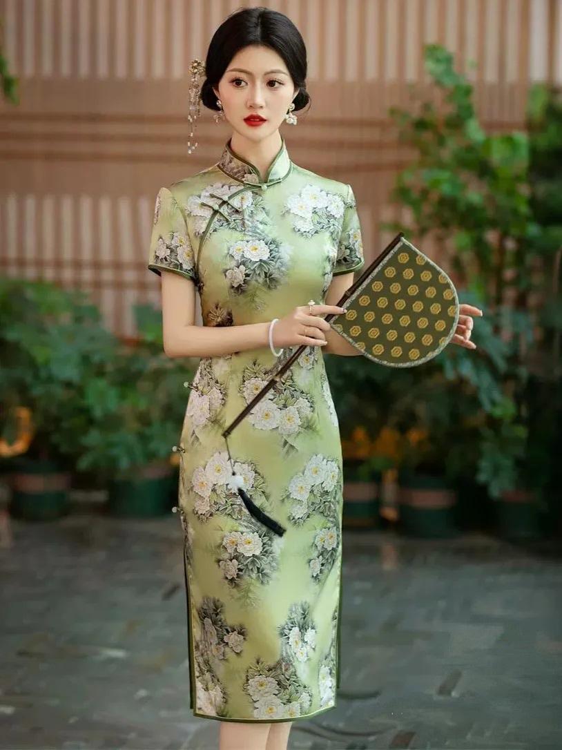 这组照片里的旗袍造型实在太惊艳了,浅绿色的底色配上水墨花卉,清新淡雅,仿佛把整个江南的春色都穿在了身上,温婉又大气。 这套旗袍一眼就能看出是新中式风格。它保留了传统旗袍经典的立领、斜襟和盘扣元素,修身的剪裁勾勒出曼妙的曲线。但与传统长袍不同,它采用了改良的中长款设计,裙摆开衩到膝盖附近,既保留了旗袍的端庄,又多了一份现代的利落感和透气感。 在搭配上,她选择了同色系的古典发饰和玉石耳环,手持一把复古的团扇,整体造型完整度很高。这种穿搭非常适合夏季出游、茶会或者参加一些有文化氛围的活动,既清凉舒适,又能展现出东方女性独特的韵味。