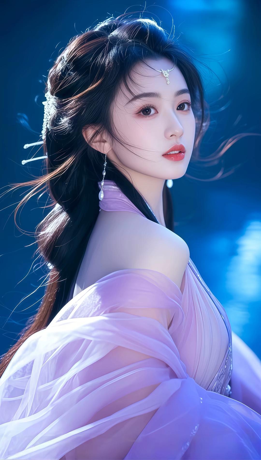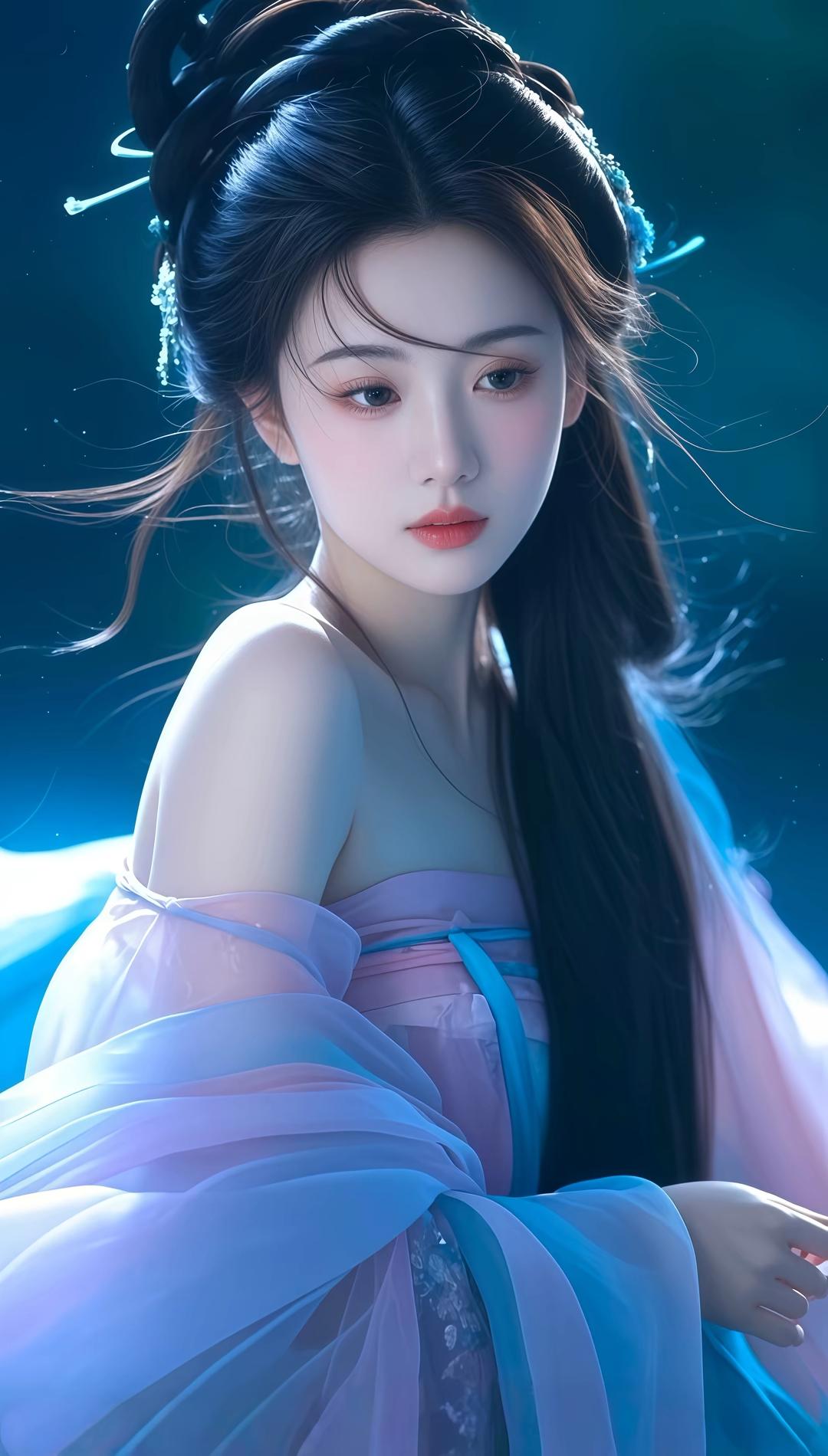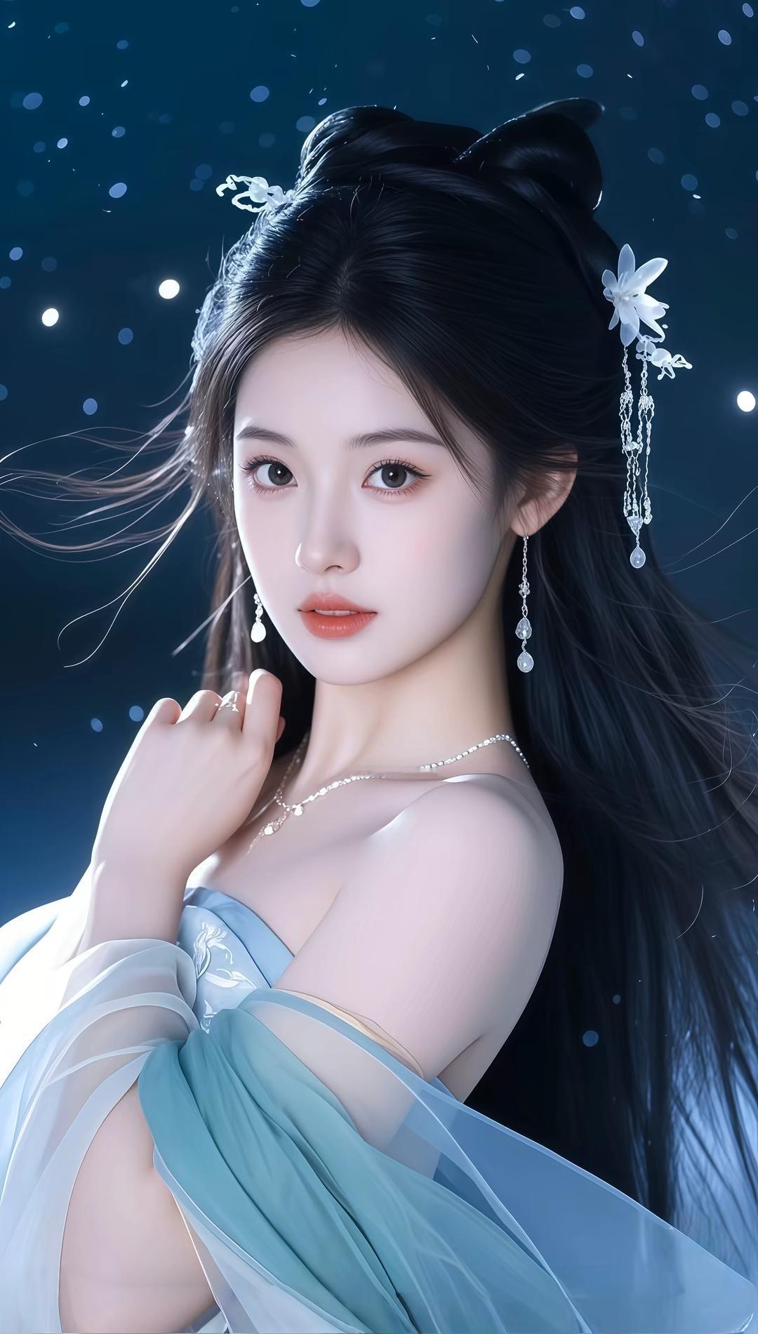 这组图片展现了一位身着古风服饰的女性,整体风格唯美梦幻,充满仙气。她穿着飘逸的汉服,色彩以淡蓝、粉紫为主,搭配精致的发饰和轻盈的纱质面料,营造出一种超凡脱俗的氛围。背景多为深蓝色调,点缀着星光或水波纹,进一步增强了画面的梦幻感。她的姿态优雅,或侧身回眸,或低头凝思,每一个动作都流露出古典美人的温婉与神秘。