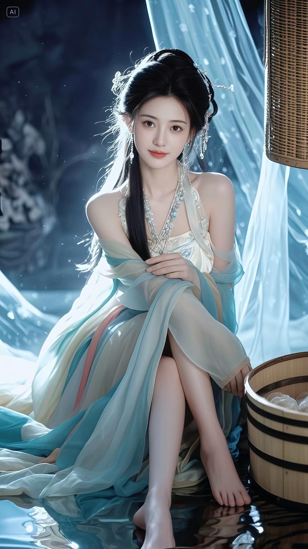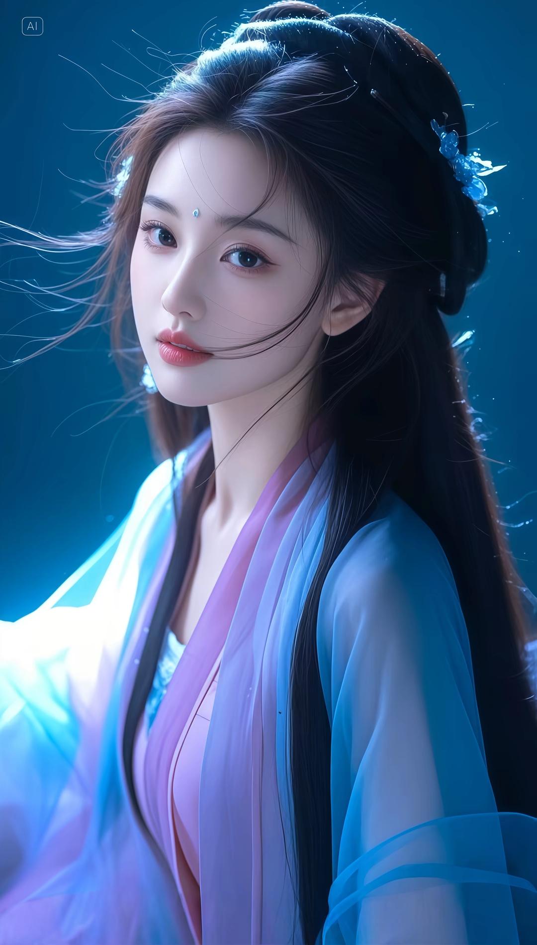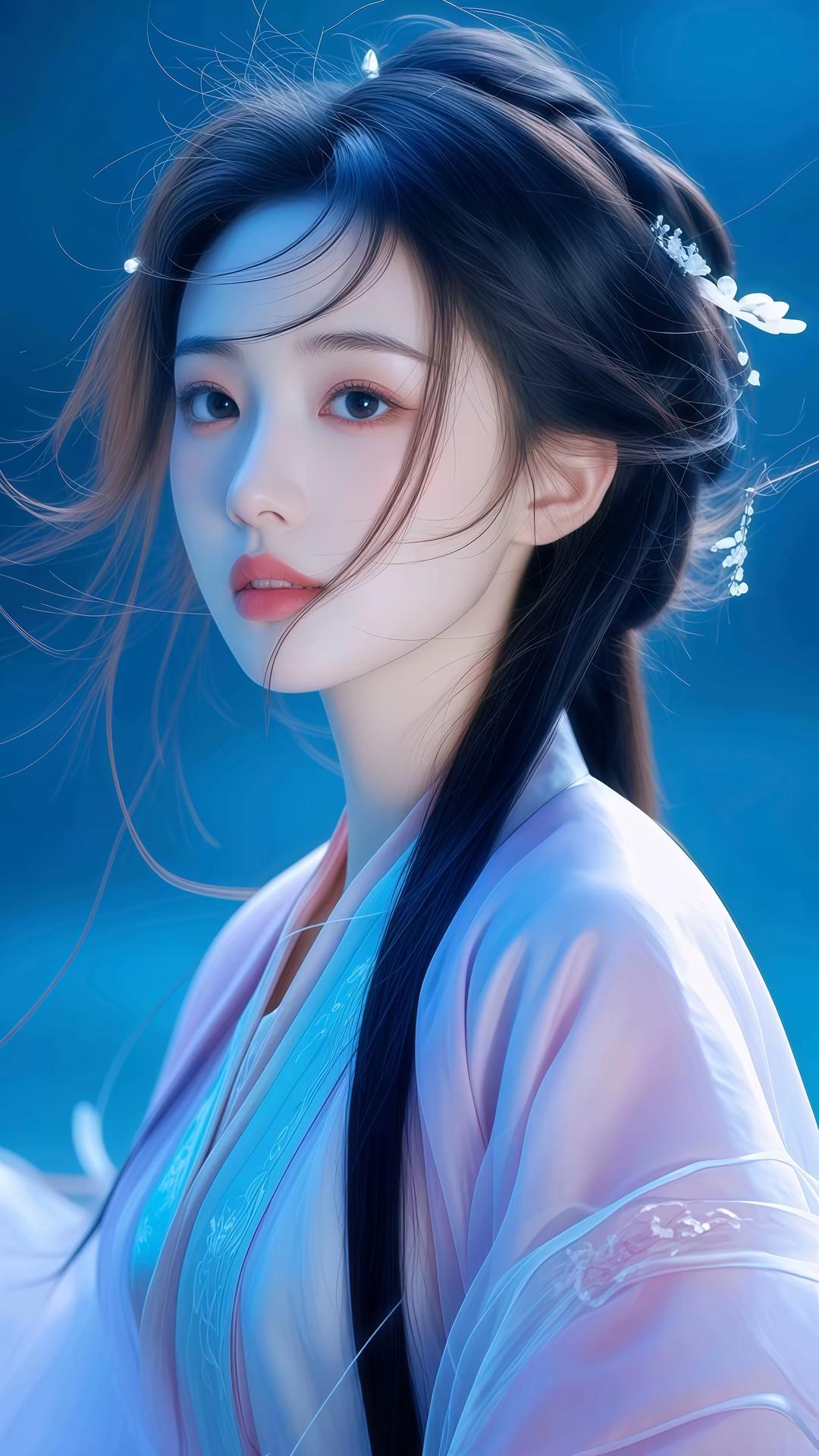 这组图片展现了一位身着古风服饰的女性,整体风格唯美梦幻,充满仙气。她穿着飘逸的汉服,色彩以淡蓝、粉紫为主,搭配精致的发饰和轻盈的纱质面料,营造出一种超凡脱俗的氛围。背景多为深蓝色调,点缀着星光或水波纹,进一步增强了画面的梦幻感。她的姿态优雅,或侧身回眸,或低头凝思,每一个动作都流露出古典美人的温婉与神秘。