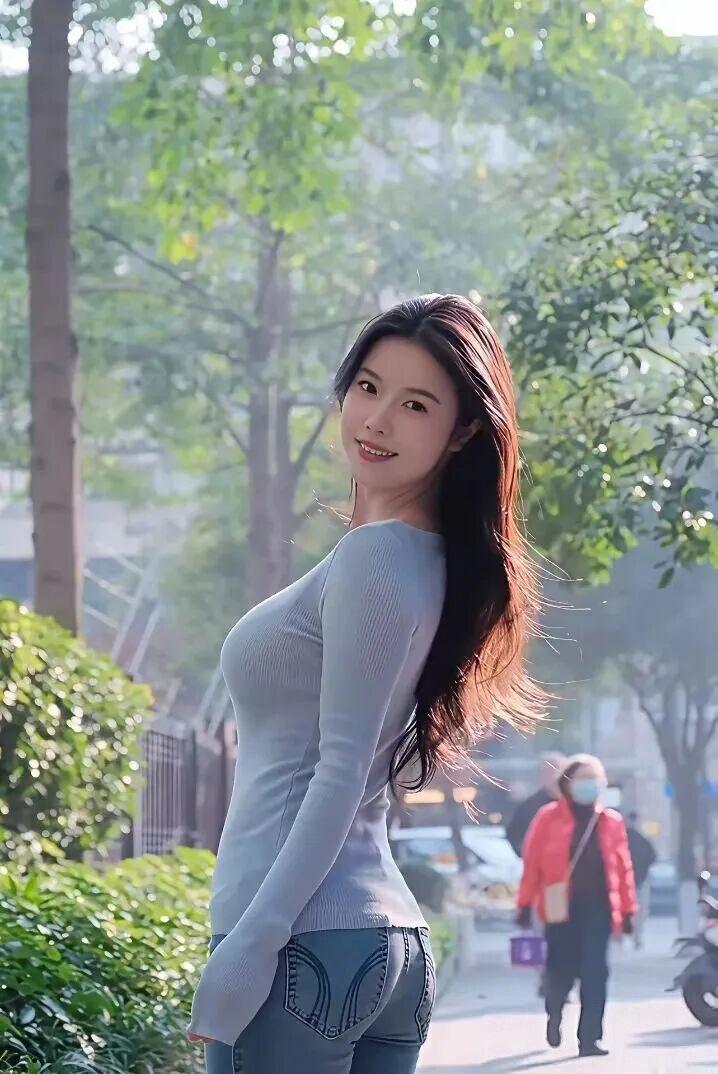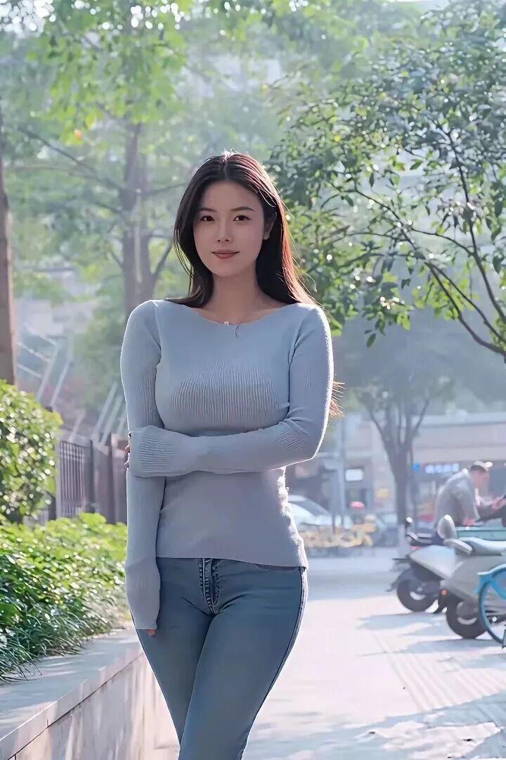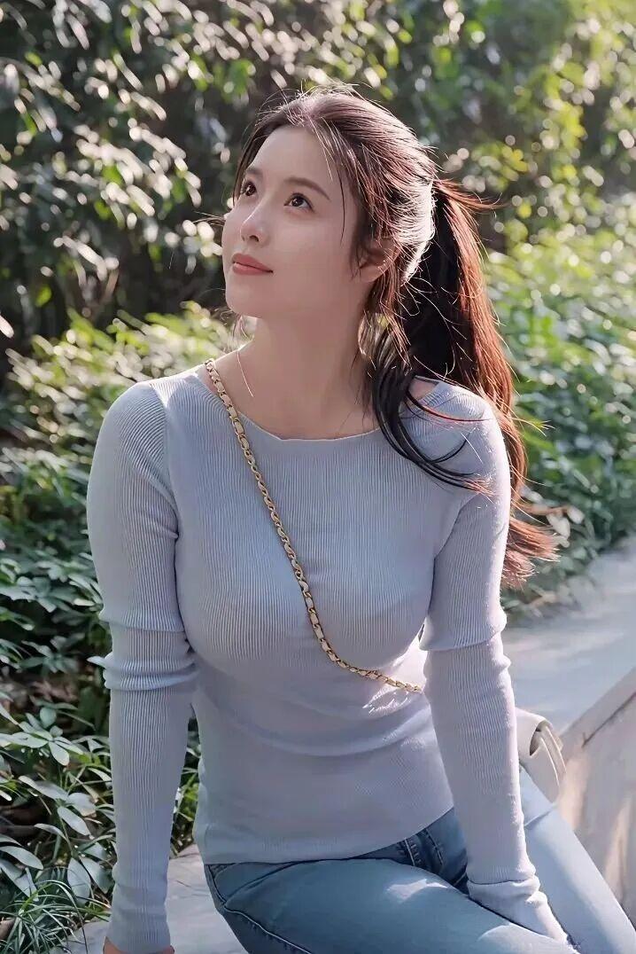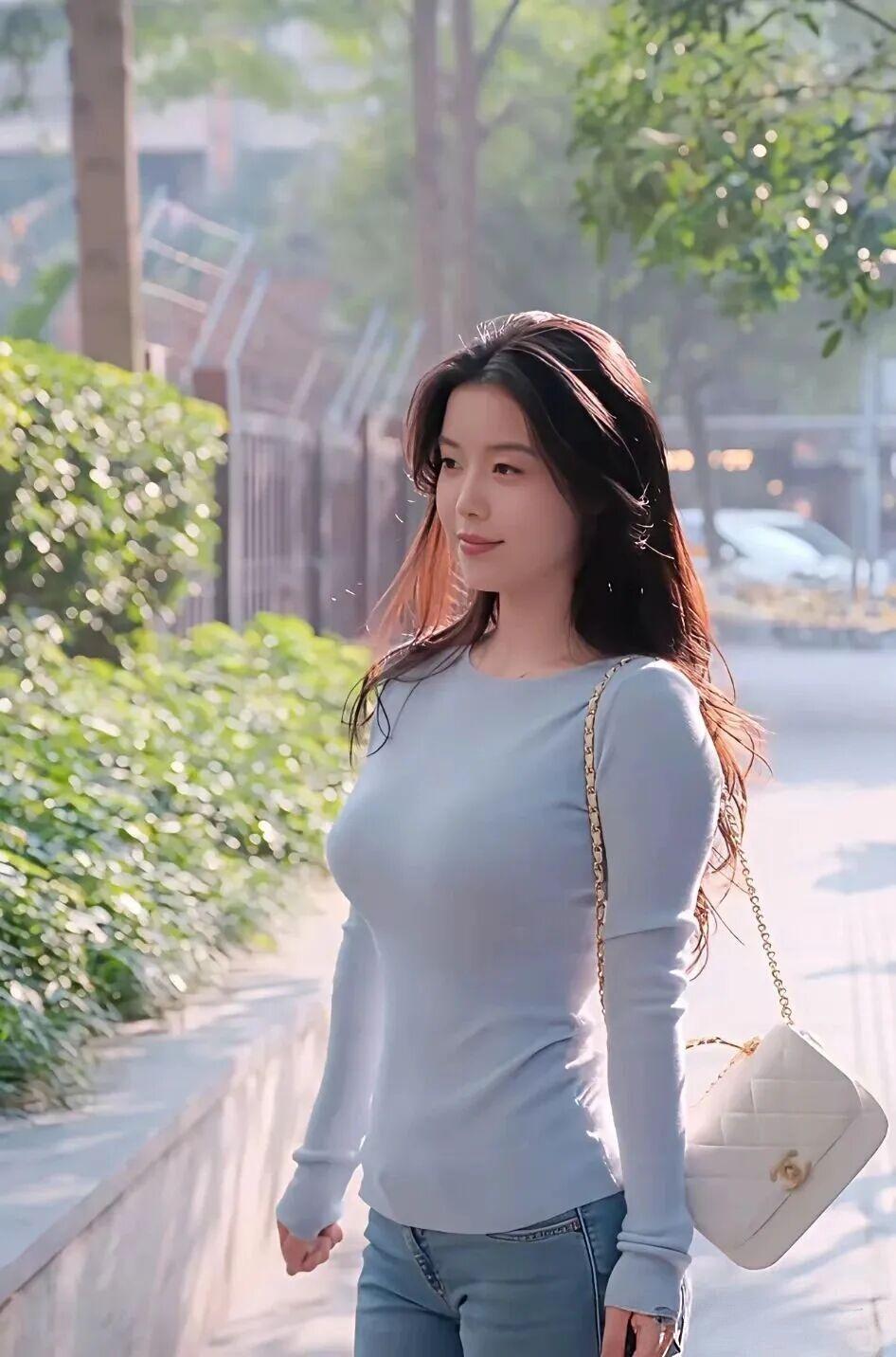 阳光洒在肩头,浅蓝针织衫勾勒出温柔的曲线,牛仔裤随步伐轻摆,白色链条包点缀出精致感。她站在绿意盎然的街角,微风拂过发梢,笑意如春水般漾开,仿佛连空气都染上了清甜的气息。这组照片捕捉的不只是穿搭的简约美学,更是日常里不经意流露的优雅与自信——无需繁复装饰,自然光下的每一帧,都是对“舒适即高级”的最佳诠释。
