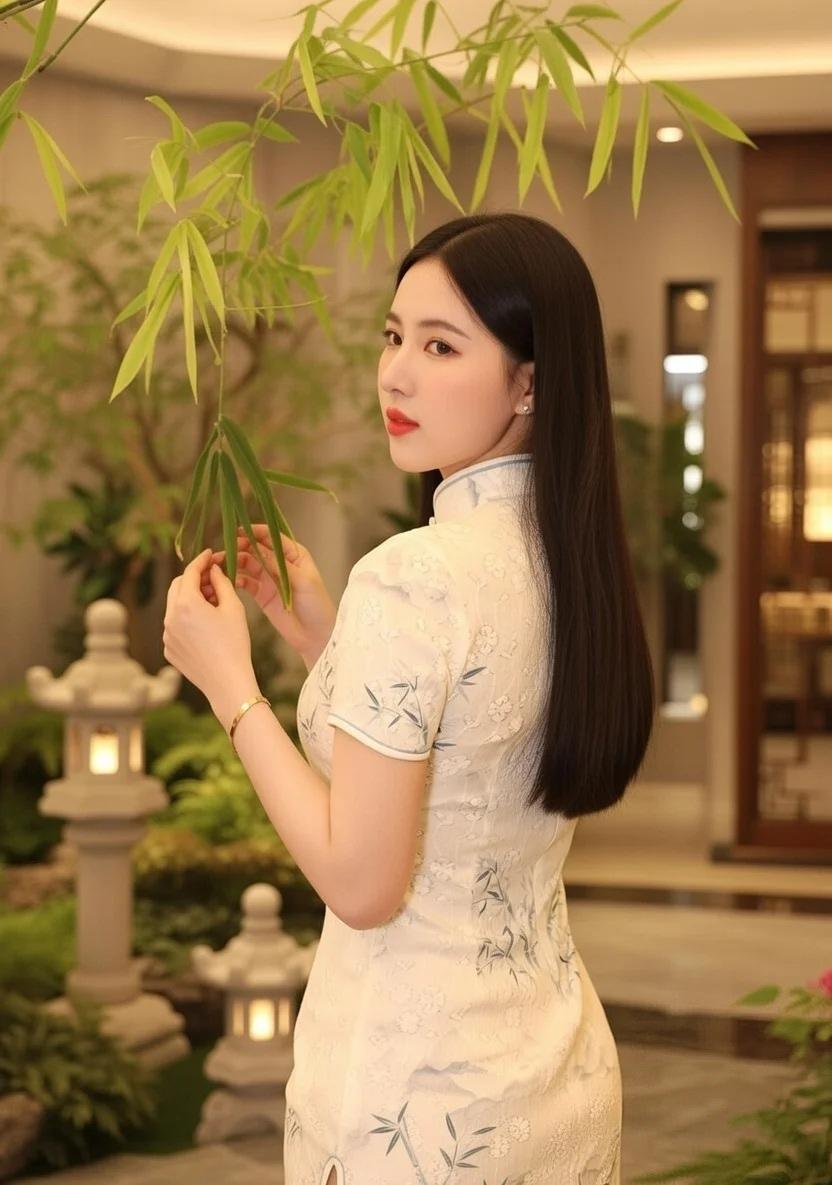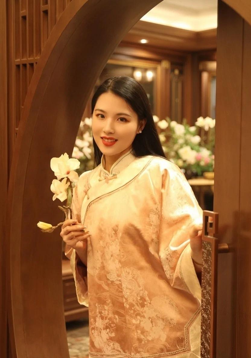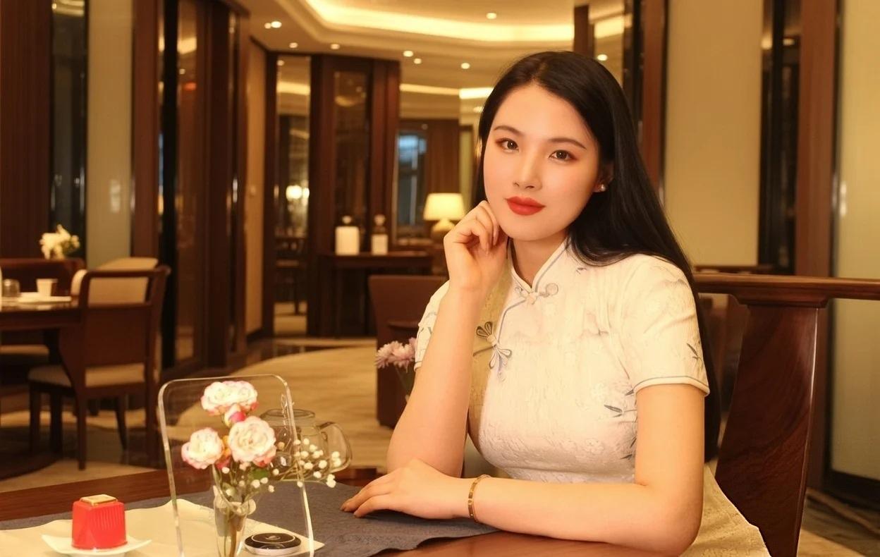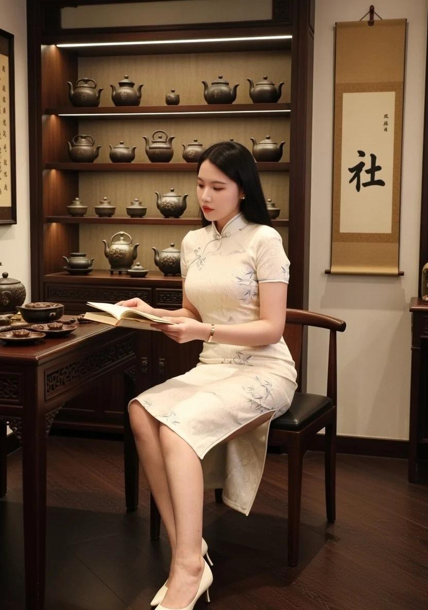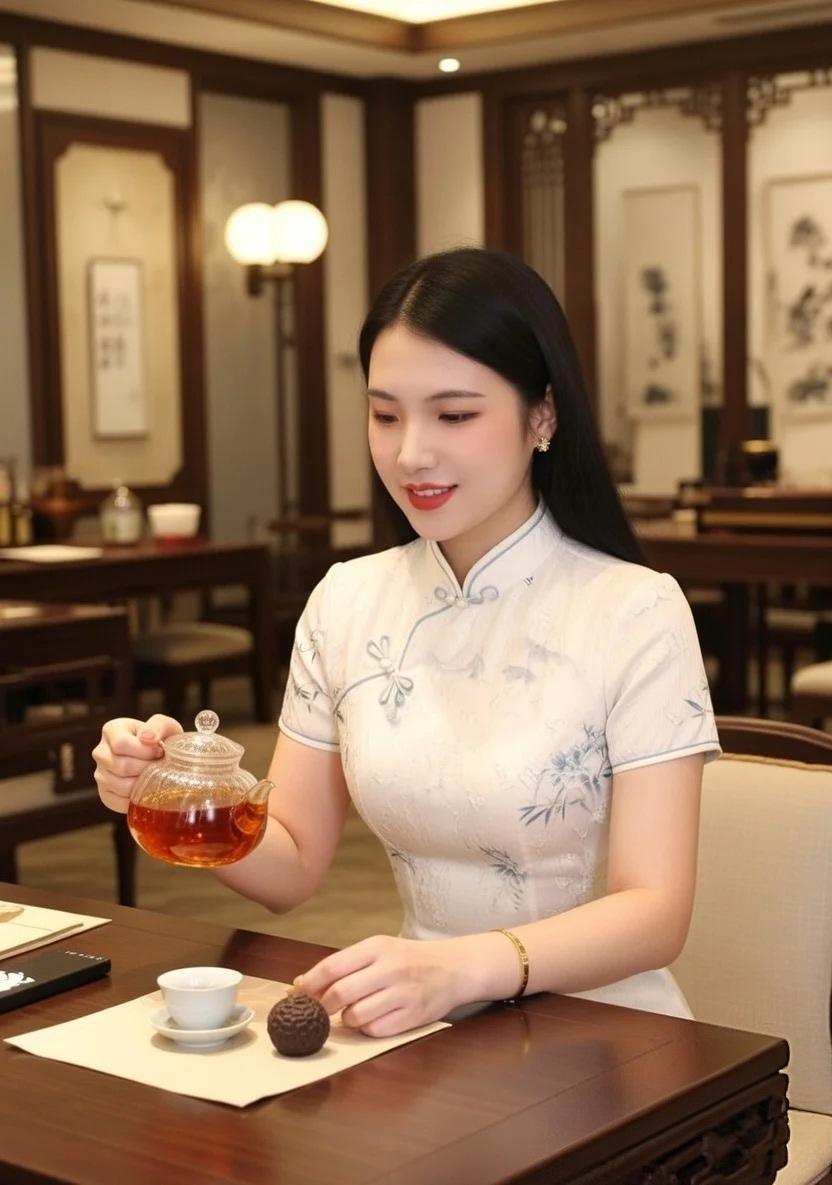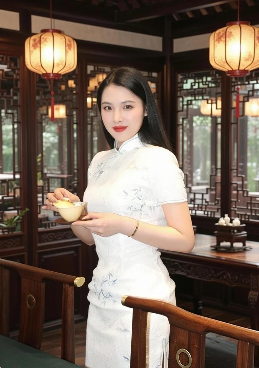 她身着一袭素雅旗袍,立于古韵茶室。白底蓝纹,如水墨晕染,勾勒出东方女性的温婉与端庄。手中茶壶轻倾,茶香氤氲,时光仿佛在这一刻静止。一颦一笑,皆是古典与现代的完美交融,尽显新中式美学的优雅从容。