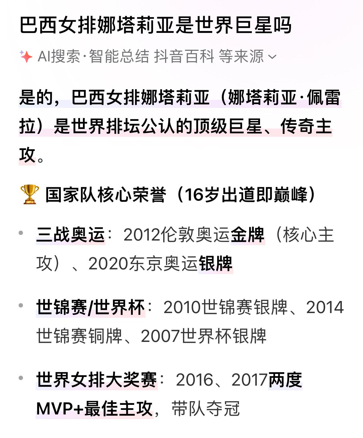 天津女排的巴西外援娜塔莉娅在中国名气不是很大,但在国际上那可是顶级球星。 虽然娜塔莉娅已经36岁了,但作为职业球员的她状态依然保持良好。 天津女排的两个外援娜塔莉娅、马丁内斯都是世界著名球星。 看来天津女排这个赛季为了取得好成绩也是下本钱了。 但天津女排的青年队成绩不值一提。 如何保持买外援取得短期好成绩,兼顾后备队伍的培养,这确实是一道好题目。 江苏女排很极端,坚持不买外援,把金钱资源投入到青训,按照江苏女排现在的阵容,如果有一个范赖克这样的接应,可以说,打遍天下无敌手。 江苏女排对中国女排的贡献无疑最大,否则,打包队不是白叫的。 江苏女排,8年时间,共获得四个冠军:两个全运会冠军,两个联赛冠军。如果,江苏女排在张常宁养伤期间买一个强有力的外援,也许这八年会获得8个全国冠军,不会有什么千年老二的名声。