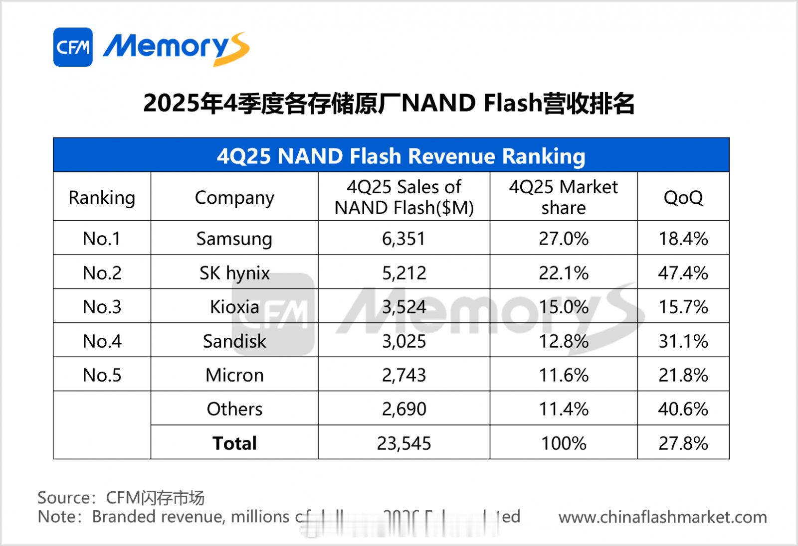 25Q4排名前5的NAND厂商占全球总营收的88.6%,SK Hynix是四季度增长最快的厂商,同比增长47.4%。