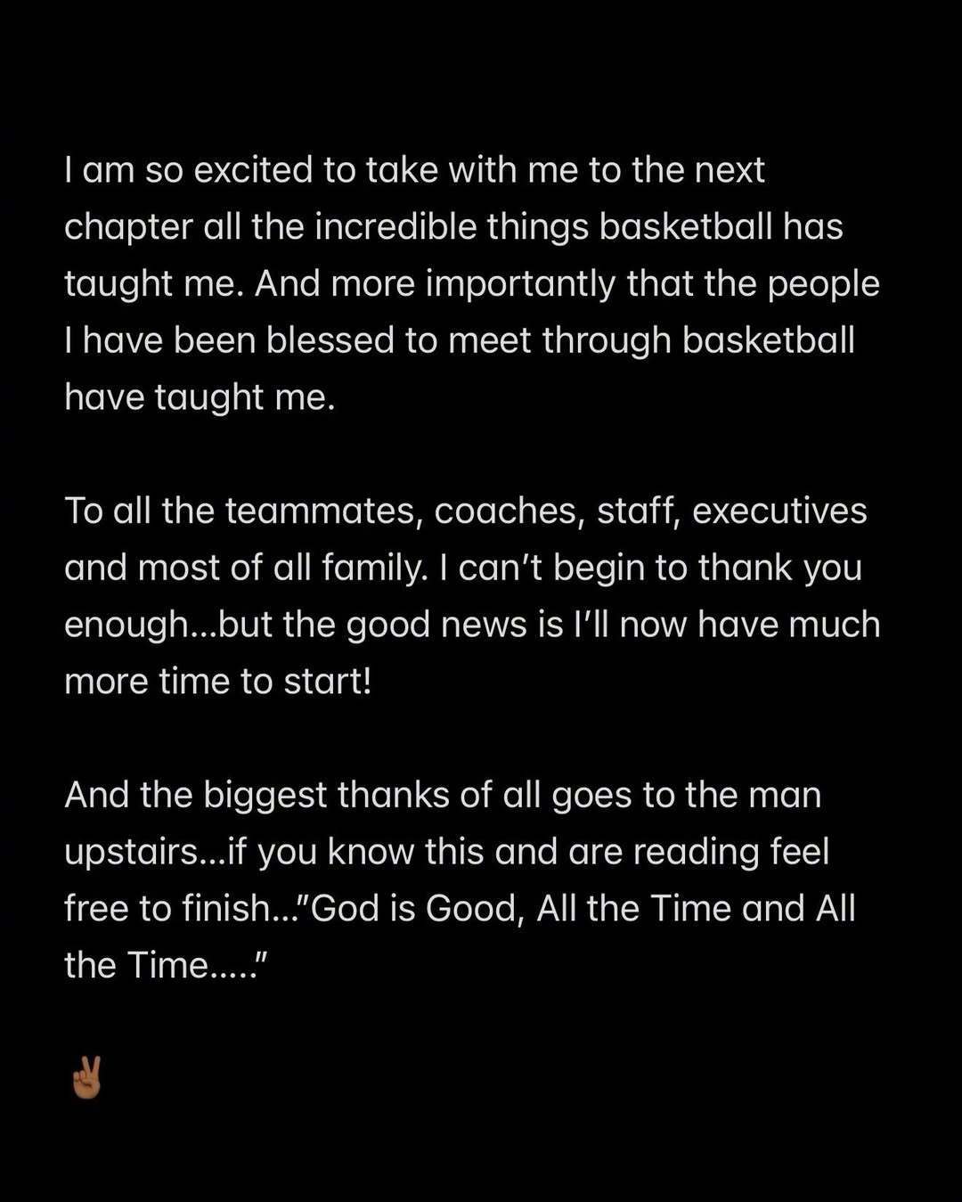 致所有队友、教练、工作人员、管理层,球迷、尤其是我的家人——对你们的感谢之情我数不清道不尽。不过好在我有了大把的时间,将来向你们一一表达。