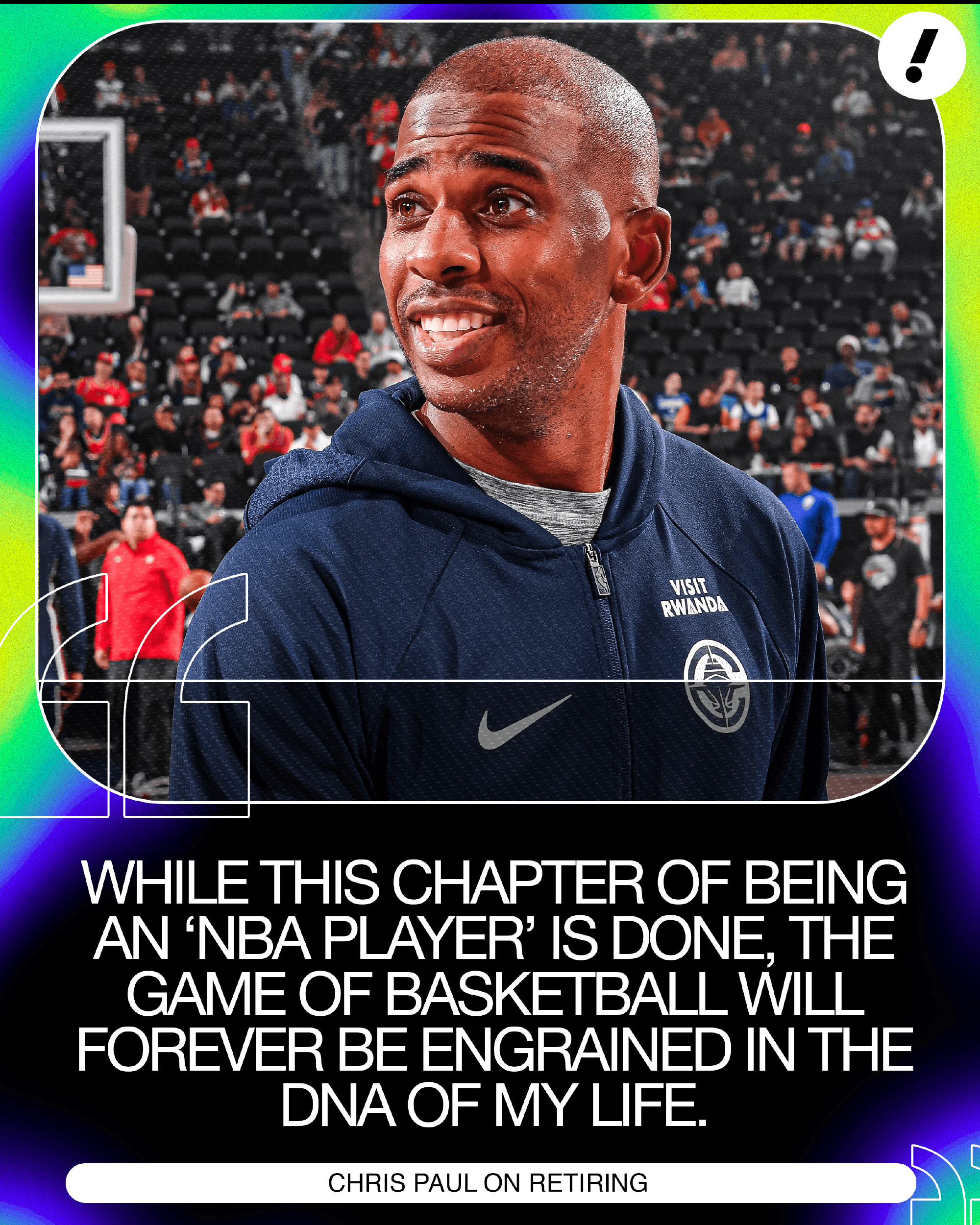 于是现在,满怀着感激之情的我,是时候为了他人、以其他方式去“守护与陪伴”(show up)了。这最后一个赛季,我意识到除非能和家人待在一起,否则我无法再坚持下去。那分别的六年对我们所有人来说都是巨大的牺牲,我知道是时候结束这种生活了。而我现在全心全意地明白,最需要我这个队友的,正是 Jada(我的太太)、Chris II 和 Cam(孩子们)的!!