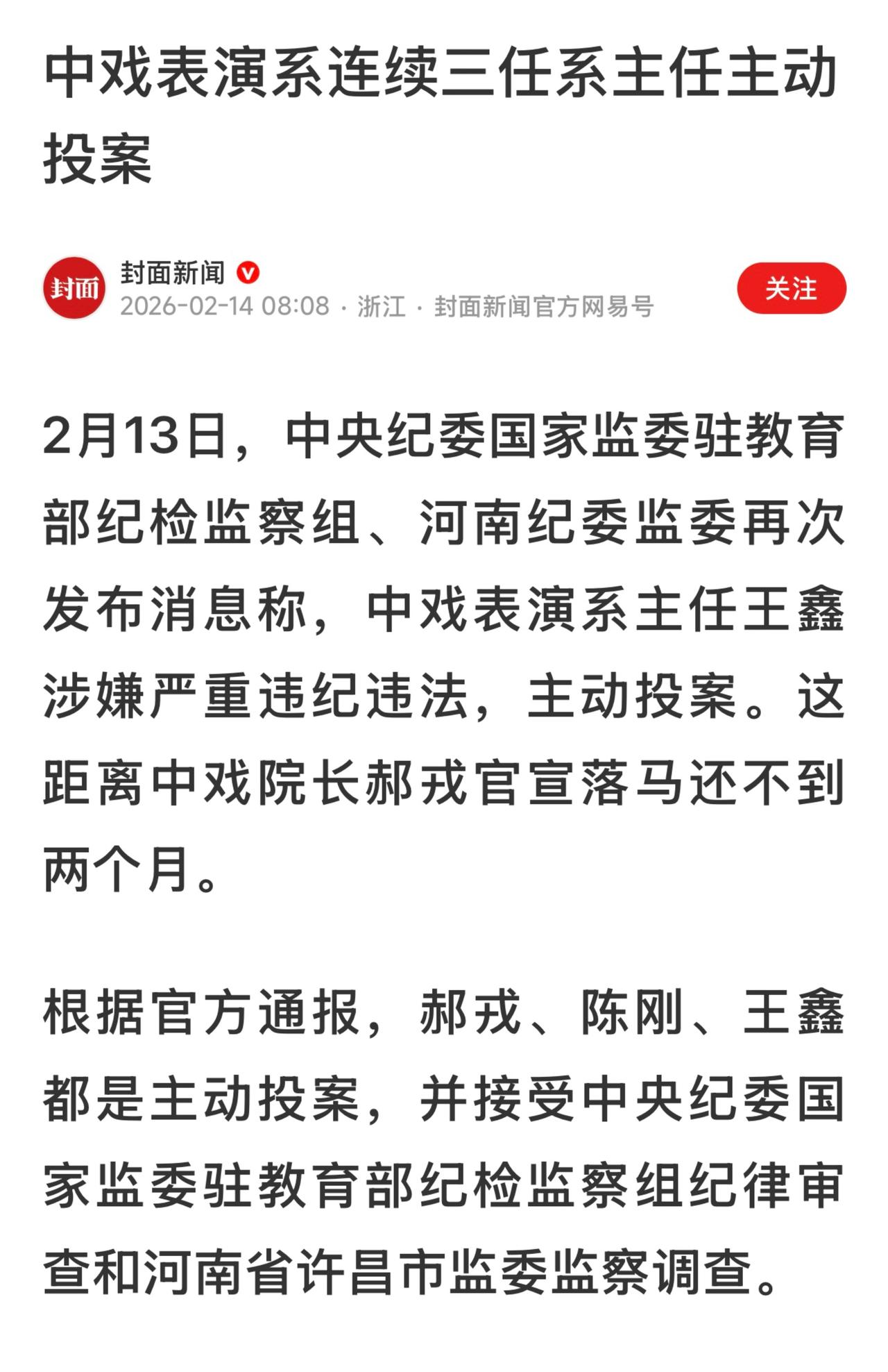 一个多月内,中央戏剧学院院长郝戎、表演系原主任陈刚及表演系主任王鑫三人,先后主动