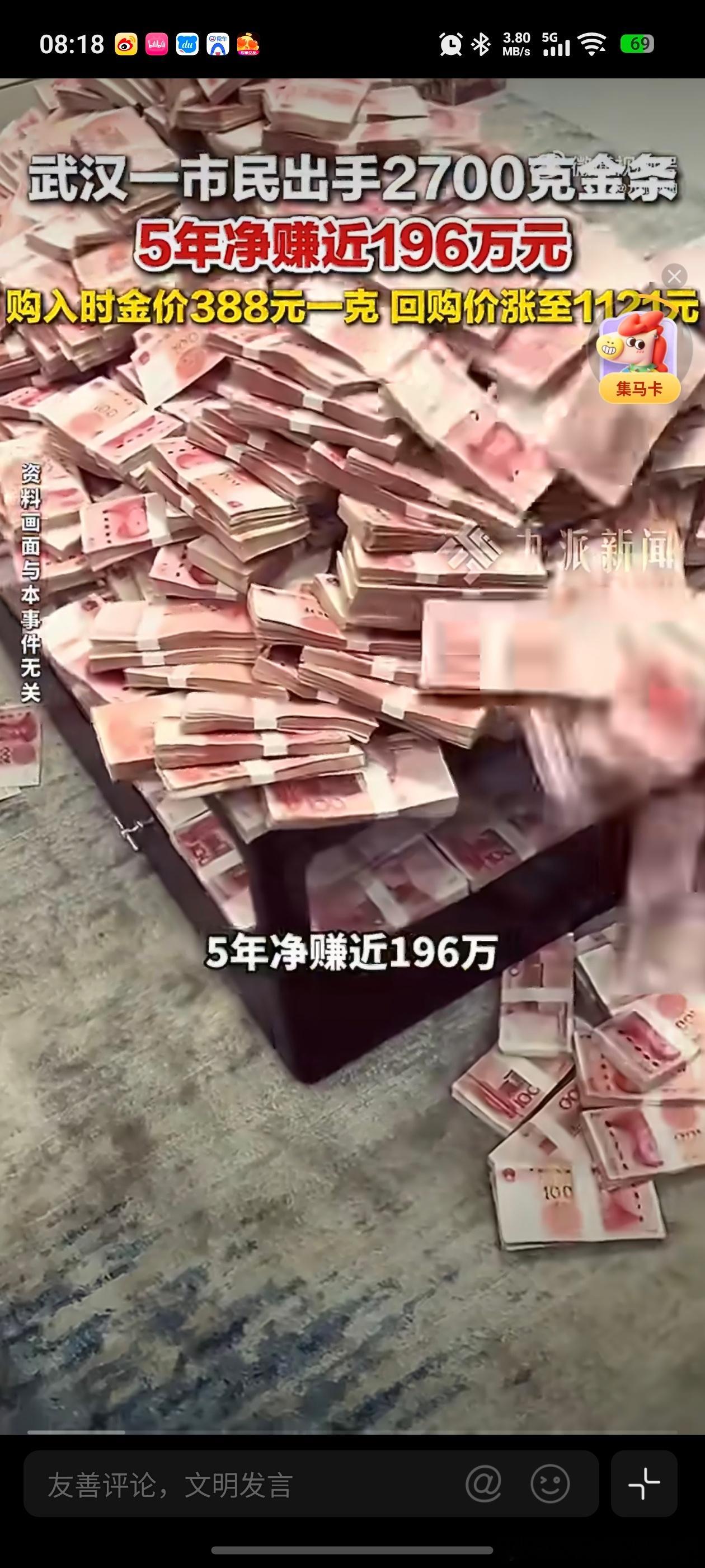 LH手机科技爱好者 2700g金条,以388元/g的价格购入;如今卖出的价格是1121元/g。真是秦始皇摸电门-赢麻了,赶上了好时候,抓住了风口,这波直接赚了一套房子了。2700克金条388元购入1121元出手