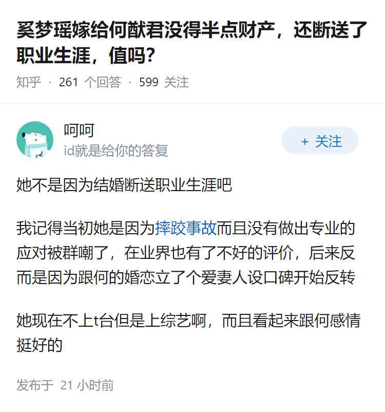 奚梦瑶嫁给何猷君没得半点财产,还断送了职业生涯,值吗?