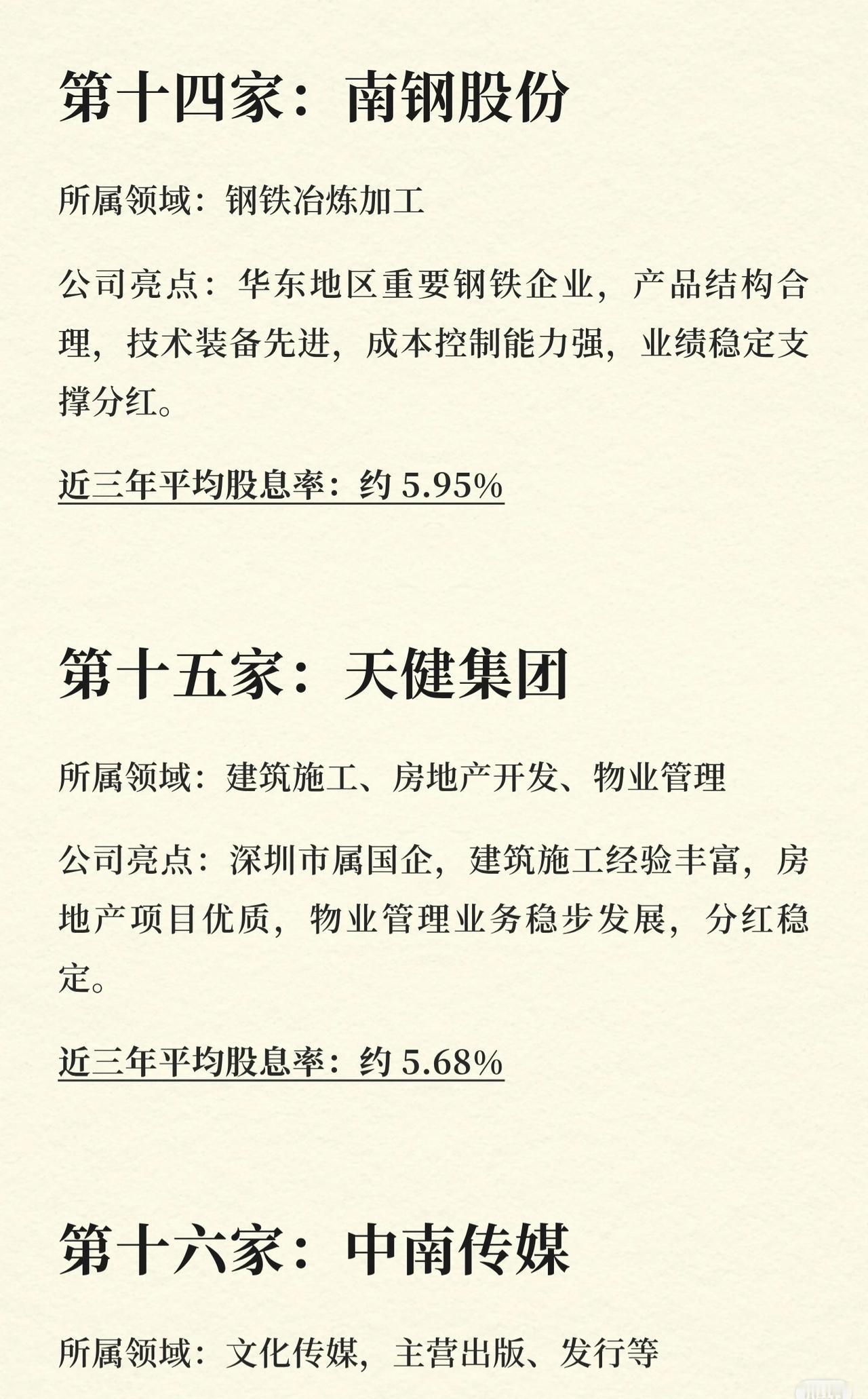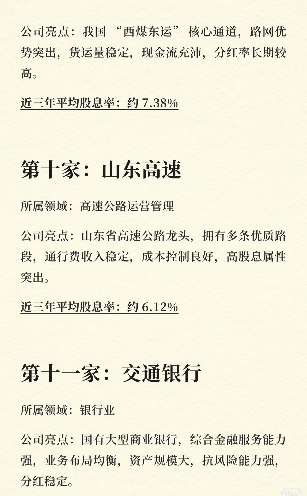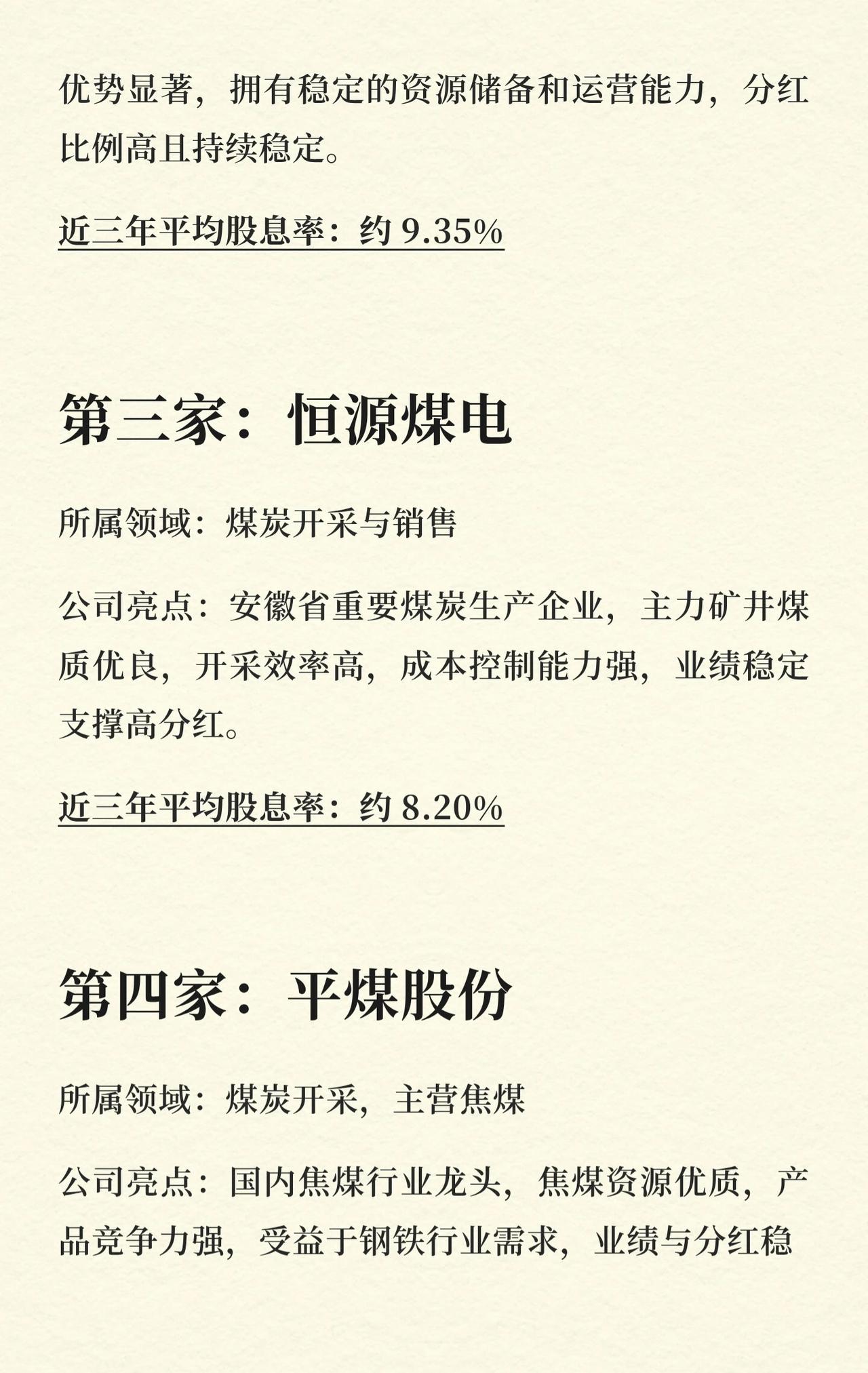 近三年平均股息率超过 5% 的多家优质公司,涵盖煤炭、银行、燃气、交通运输、钢铁、地产、传媒等行业。 这些公司普遍具备行业龙头地位、稳健的业绩与现金流、持续稳定的分红政策等特点,股息率在 5.25%~10.43% 之间。 代表性公司与股息率: 1. 兖矿能源(煤炭开采加工)— 约 10.43% 2. 中国神华(煤炭、电力、铁路)— 数据未完整展示 3. 恒源煤电(煤炭开采与销售)— 约 8.20% 4. 平煤股份(焦煤开采)— 约 9.35% 5. 富安娜(家纺家居)— 约 7.59% 6. 北京银行(银行业)— 约 6.05%(图中另有 7.24% 数据) 7. 百川能源(燃气分销)— 约 6.94% 8. 建发股份(供应链运营、房地产)— 约 5.88% 9. 大秦铁路(铁路运输)— 未完整展示 10. 山东高速(高速公路运营)— 约 6.12% 11. 交通银行(银行业)— 未提股息率 12. 淮北矿业(煤炭、煤化工)— 约 6.86% 13. 中国银行(银行业)— 约 5.80% 14. 南钢股份(钢铁冶炼加工)— 约 5.95% 15. 天健集团(建筑、地产、物业)— 约 5.68% 16. 中南传媒(文化传媒)— 约 5.25% 核心结论: 这些公司集中在高分红、业绩稳健、行业优势明显的领域,适合关注稳定收益与股息回报的投资者。