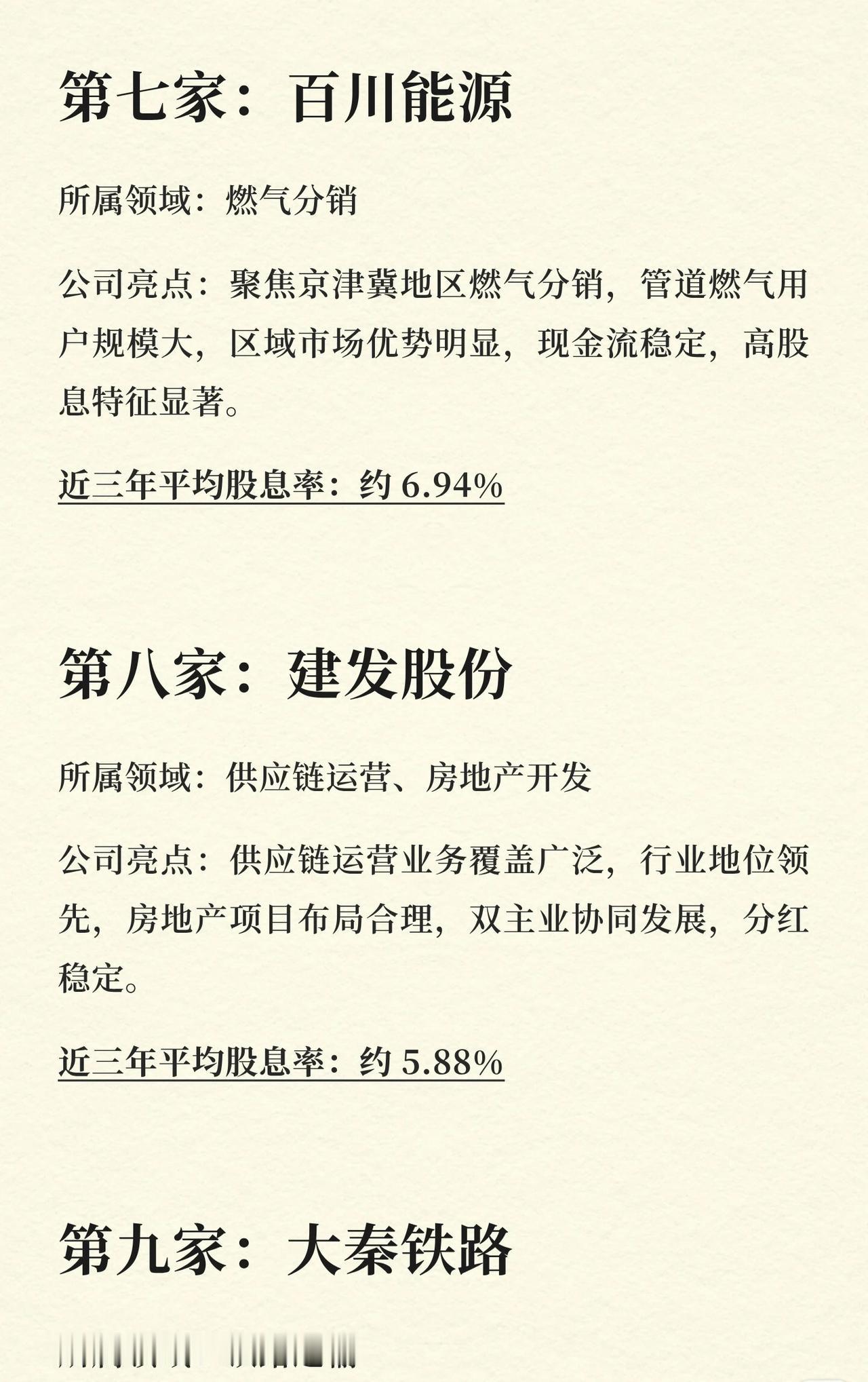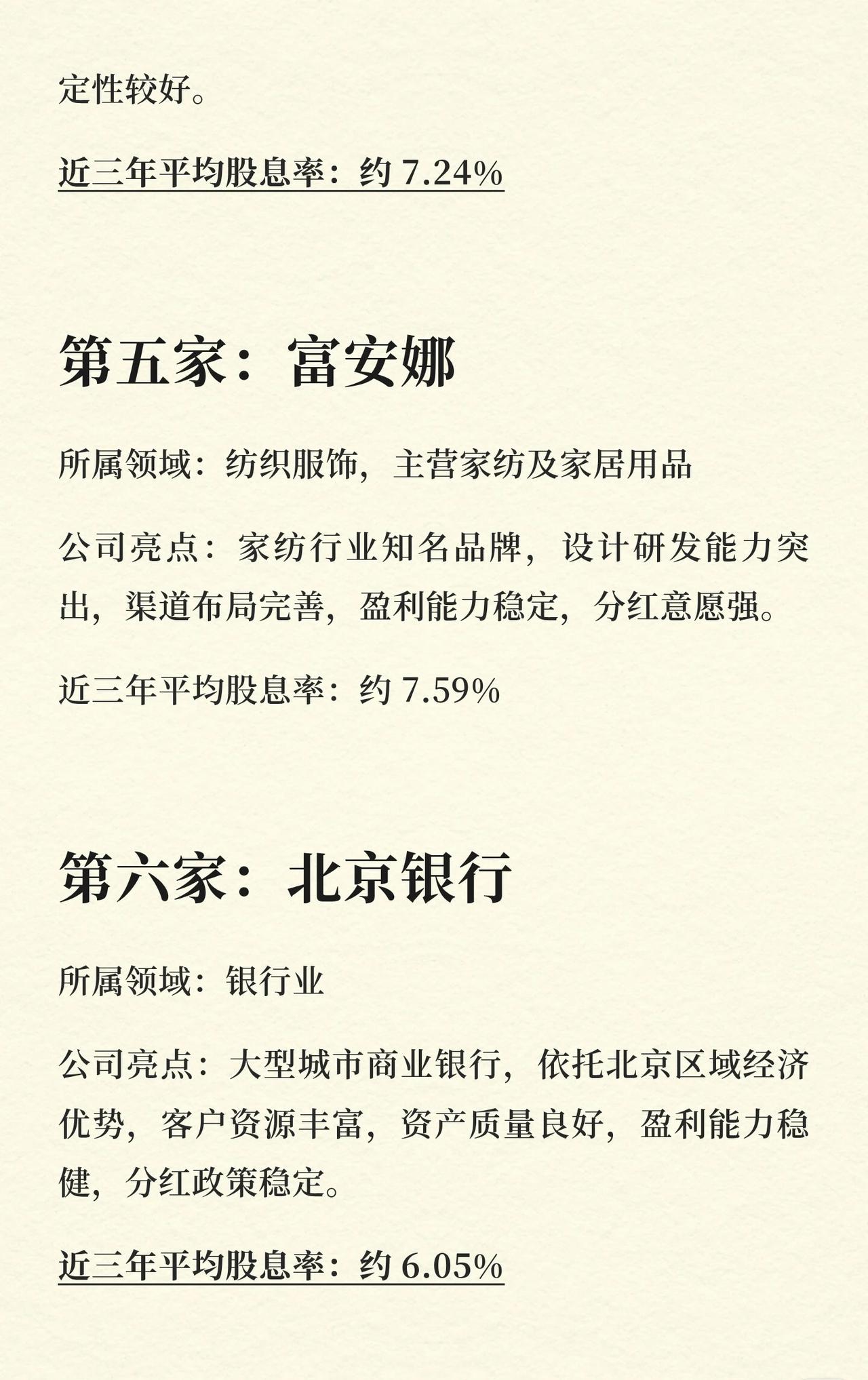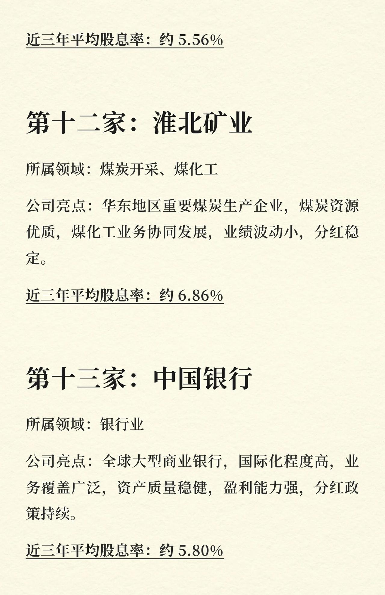 近三年平均股息率超过 5% 的多家优质公司,涵盖煤炭、银行、燃气、交通运输、钢铁、地产、传媒等行业。 这些公司普遍具备行业龙头地位、稳健的业绩与现金流、持续稳定的分红政策等特点,股息率在 5.25%~10.43% 之间。 代表性公司与股息率: 1. 兖矿能源(煤炭开采加工)— 约 10.43% 2. 中国神华(煤炭、电力、铁路)— 数据未完整展示 3. 恒源煤电(煤炭开采与销售)— 约 8.20% 4. 平煤股份(焦煤开采)— 约 9.35% 5. 富安娜(家纺家居)— 约 7.59% 6. 北京银行(银行业)— 约 6.05%(图中另有 7.24% 数据) 7. 百川能源(燃气分销)— 约 6.94% 8. 建发股份(供应链运营、房地产)— 约 5.88% 9. 大秦铁路(铁路运输)— 未完整展示 10. 山东高速(高速公路运营)— 约 6.12% 11. 交通银行(银行业)— 未提股息率 12. 淮北矿业(煤炭、煤化工)— 约 6.86% 13. 中国银行(银行业)— 约 5.80% 14. 南钢股份(钢铁冶炼加工)— 约 5.95% 15. 天健集团(建筑、地产、物业)— 约 5.68% 16. 中南传媒(文化传媒)— 约 5.25% 核心结论: 这些公司集中在高分红、业绩稳健、行业优势明显的领域,适合关注稳定收益与股息回报的投资者。